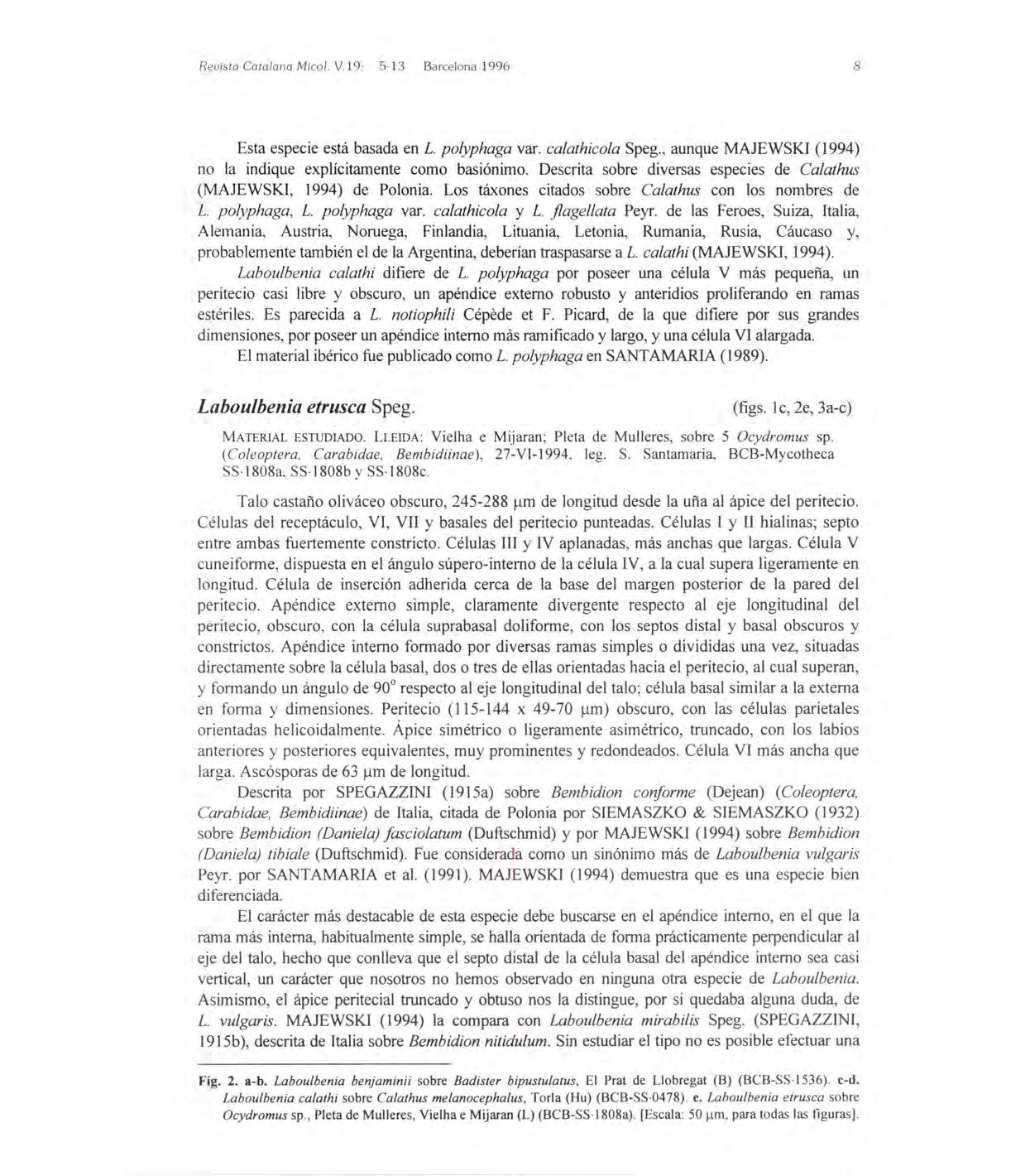 valoracióncorrectadeestaespecie,aunqueapartirdelprotólogonoparecediferirenexcesode L.etrusca. SPEGAZZINI(1915b)comparasu L. mirabilis con Laboulbenia paradoxa Speg., Laboulbenia truncata Thaxt.y Laboulbenia perpendicularis Thaxt.,aunquenocon L. etrusca.