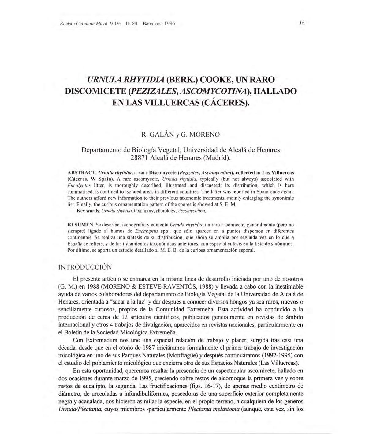 ABSTRACT . Urnu/arhytidia, a rare Discomycete (Peziza/es, Ascomycotina), collected in Las Villuercas (Caceres, W Spain). A rare ascomycete , Urnularhytidia , typically (butnot always) associated with Eucal yptus litter , is thoroughly described , illustrated anddi scussed; its distribution , which ishere s umrnarised , is confined to isolated areasin different countries The latter was reported inS pain once again The authors affordnew information to their pre vious taxonomic treatments , mainly en larging t hesy nonimic list. Finally , the curious omamentation pattem ofthe sporesis showed atS E M.