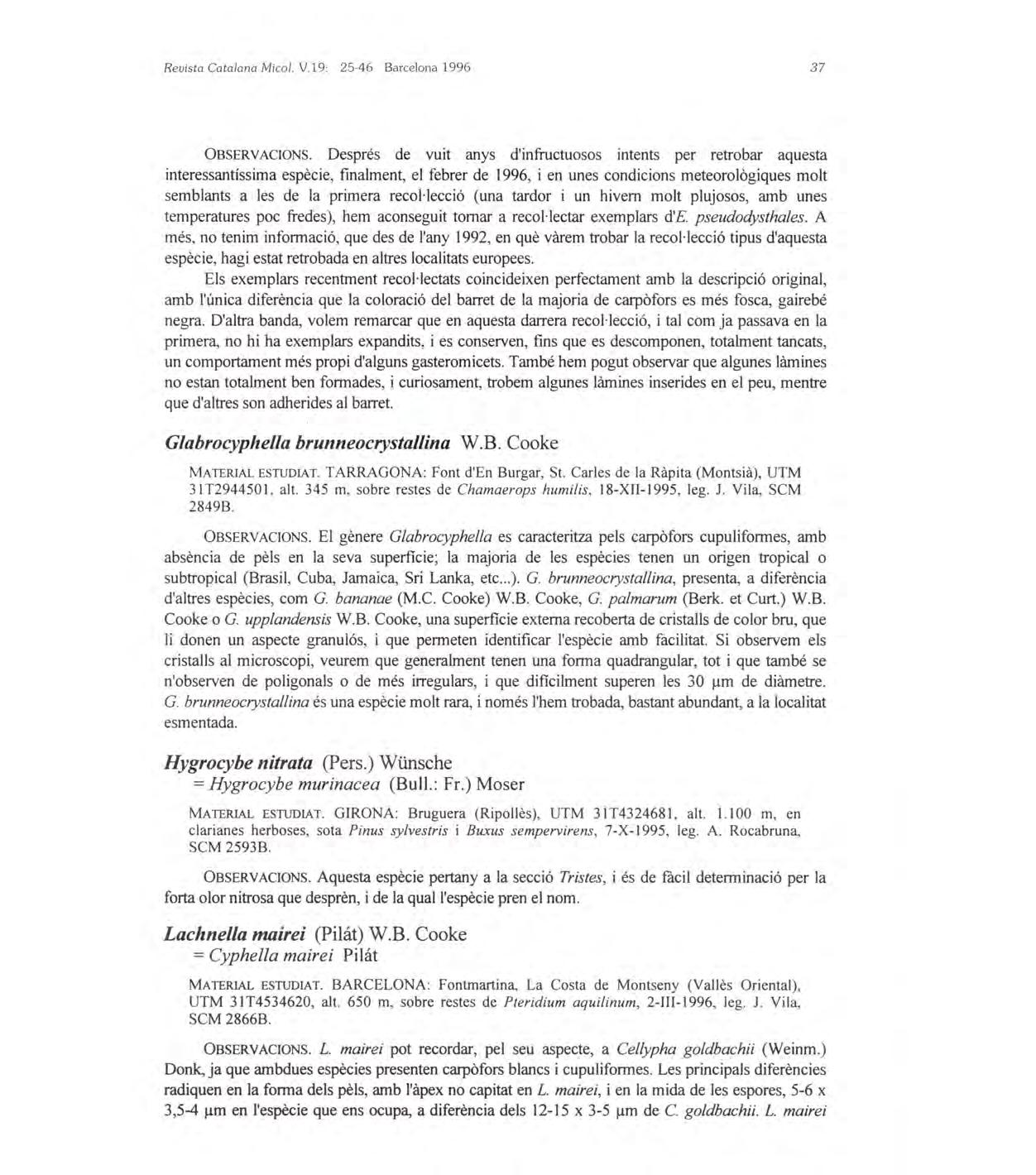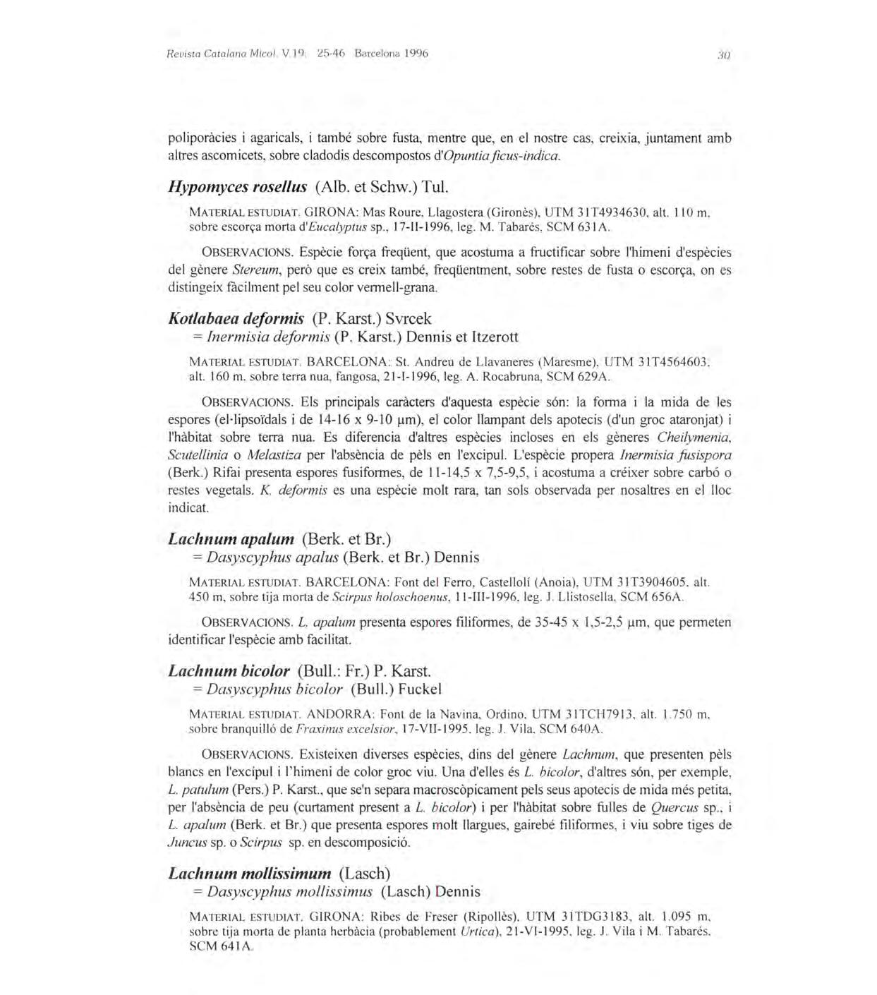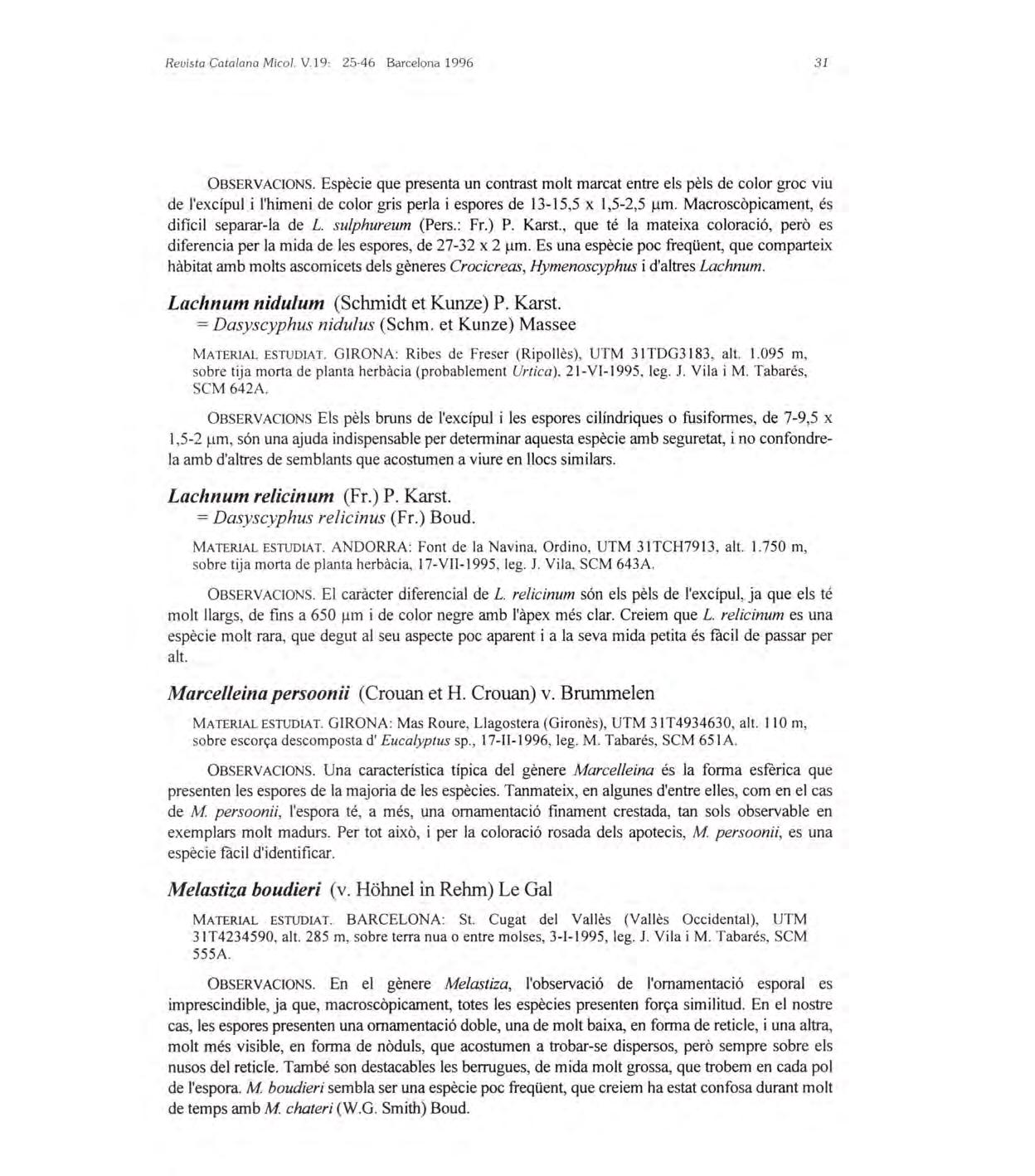 Ene l Santuariode N úria, RibesdeFresser (Ripo lIés), sobre Pinusmugo ssp. uncinata y en primavera,hemosrecolectado Lachne lulla s uec ica (de Bar)'exFuck.)Nannf.(verSIERRA, 1987), inconfundible rnicrosc ópicamente,por susesporas esféricas.
