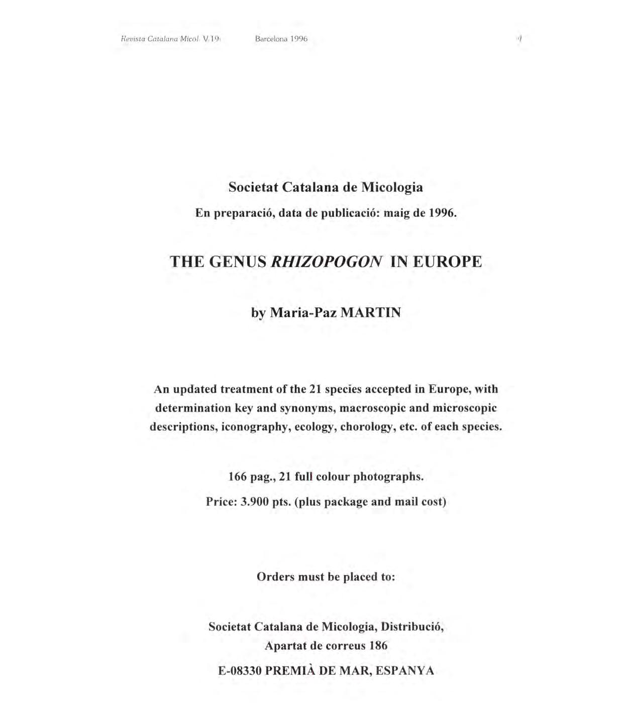 Societat Catalana de Micologia, Distribució, Apartat de correus 186 E-08330 PREMIÀ DE MAR, ESP ANYA