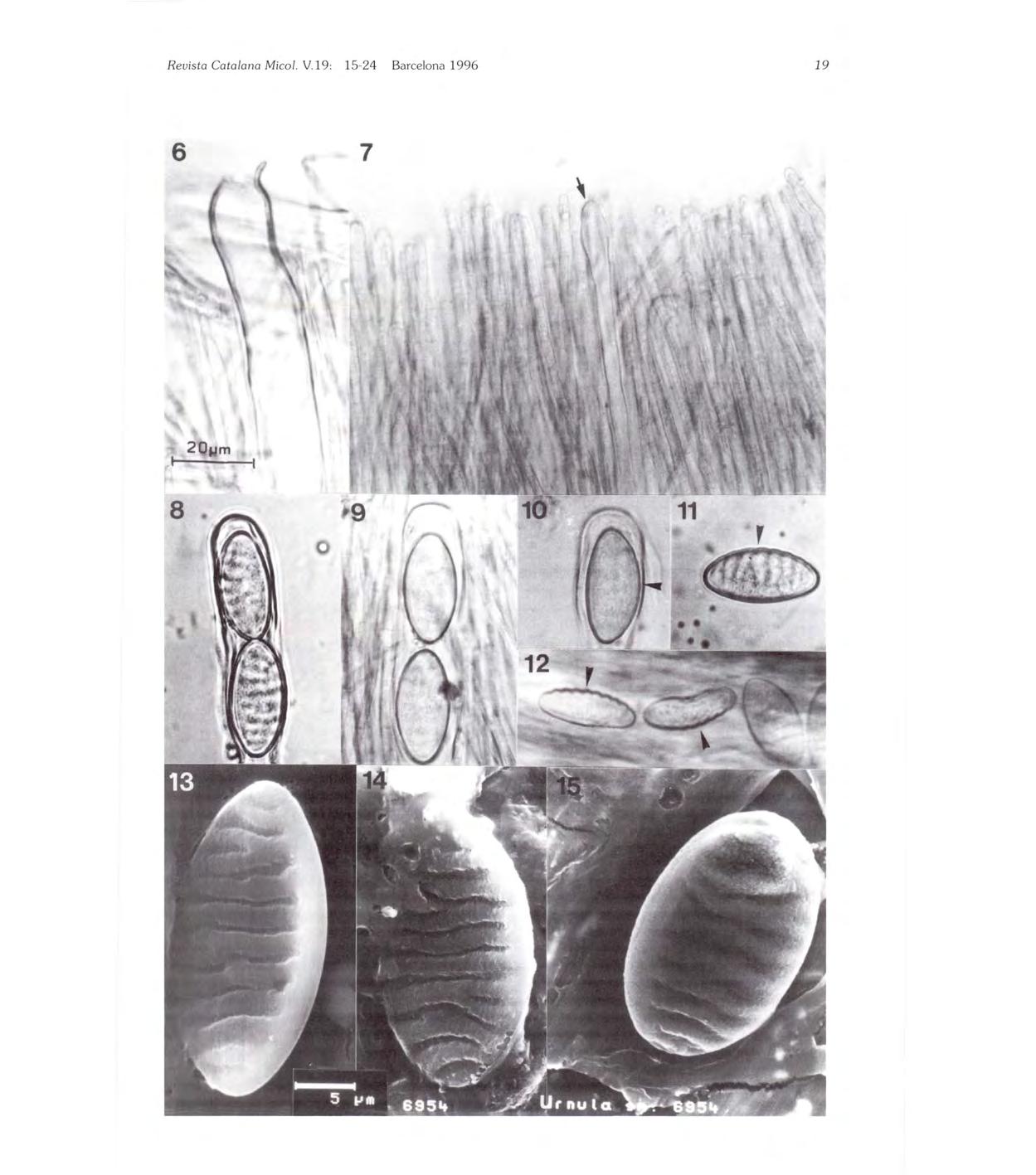 característicos grànulos rojoana ranjados que c ubrenel recept àculo deesta última)- habíamos visto t antas veces antes , fotografiadas o simpleme nte ilustradas enlaliteratura.No obstante, yaenel laboratorio, el examen del material almic roscopio óptico nos sorprendió vivamente, cuando pudimos comprobar que las ascósporas noer an lisas, como tampoco débilmente verrugosas [como enel caso de P . melastoma, de acuerdo conlas observaciones deLE GAL (1958: 170)],sinoque est aban transve rsa lmente r ecorridas por u na seriedecost illas sobreelevadas e incompletas (alternàndose éstasconlosres pectivos surcos) quelas hacía espectaculares.