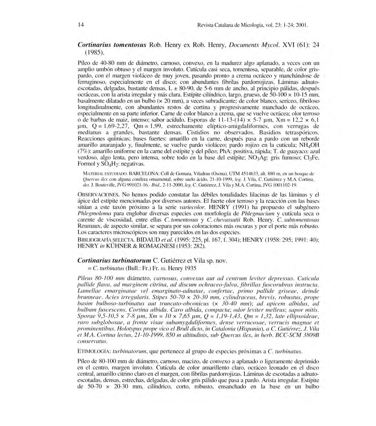 Ene sta segunda aportación a l gé nero Cortinarius en Catalunya (la primera corresponde a GUTIE RREZ & MAHI QUES , 2000)se h anest udiado 19 especies recolectada s so bre todoen encinare s (Quer cus ilex) , tantosobres uelo basico (Serra del 'Arca , el B rull;Can Terrers , Seva ) como acido (Riellsde Montseny ), a unque enesta última l ocalidad , el encinar viene acompañado , frecuentemente , de alcornoques (Q. suber ), ca staños (Castan eas ativa) ypino s ( Pinus s p.pl.).Enelpresenteartículo hemosestudiadocondeta lle elcomplejodeC. turbinatu s (Bull.:Fr.)Fr. y susmúltiplesinterpretaciones , proponiendounnuevo nombre , C. turbinatorum C.GutiérrezetVila , paraelquedescribe HEN RY (1935) , diferentealque aparecedescritoenla s obra s deFries , Q uélet o B ataille.Adernasdelabib liografía aq ue hacemos referencia encada caso concreto , también h emos utilizado,co n ca r àcter general , los trabajos deTA RT ARAT (1988) Y deGA RNIE R ( 1991, 1992).Lassig las Xm, Q y Q mem p leadas en la descripción de l as esporas correspo nden a:me diad e l alo ngitud y d e l aanc hura, cociente long itud/a nchura y media deestecoc iente, respec tivamente. El parametro L , empleado paralas l arninas, indica el