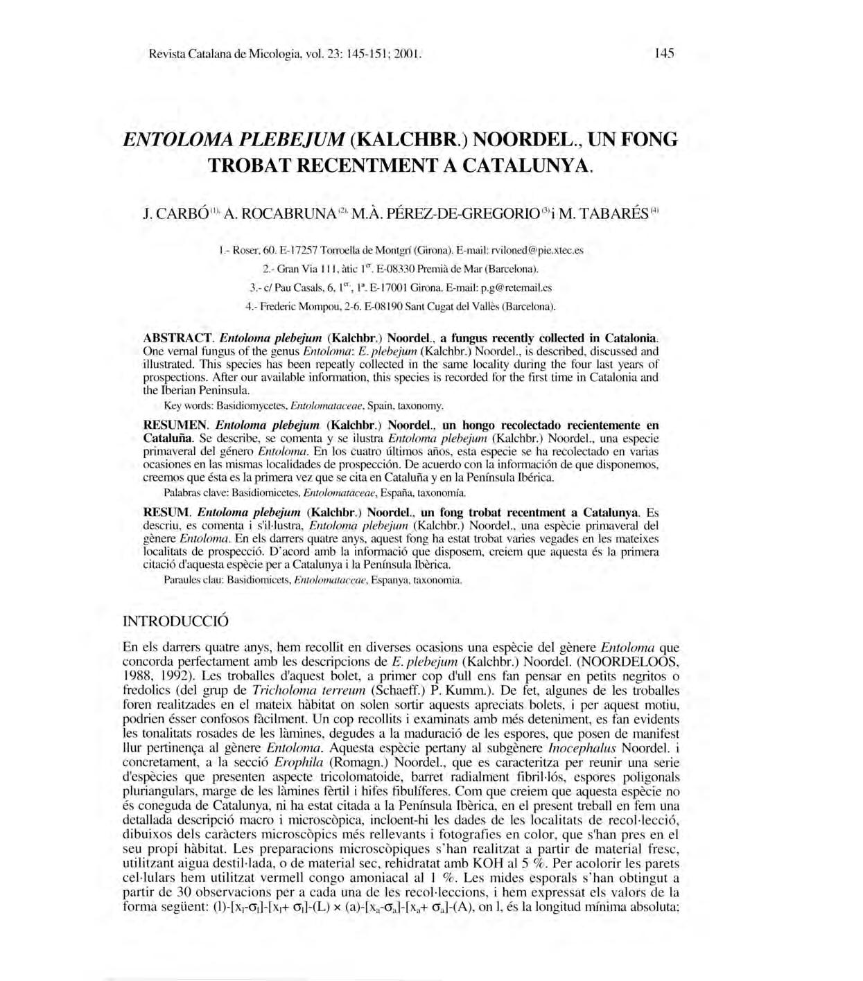 En elsdarrer s quatr e anys, hemrecollitendiverses oca sions una espèciedel gè nere En toloma que concordaperfect ament ambles de scripcions de E plebejum (Kalchbr.)Noordel. (NüüRDELüüS , 1988, 1992). Le s troballe s d 'aquest bolet , aprimercopd 'ulle nsfanpen sare np etits negrito s o fredolics (delgrupde Tri choloma terreum (Schaeff.)P Kumm. ). Defet , algunes dele s trob alles forenrealitzades enelmateix hàbitaton solen sortiraque sts apreciat s bolet s, iperaque st motiu , podriené sser confo sos fàcilment.Uncoprecollit s iexaminats ambmés deteniment , e s fanevidents les ton alitats ro sades dele s làmine s, degude s alamaduraciódeles e spores, quepo sen demanifest llurpertinençaal gè nere Entoloma. Aque sta e spècie pertany al subgènere In ocephalus Noord e1. i concretament, a lasecció Er ophila (Romagn.)Noorde1., quees caracterit za per reunir una serie d 'espècies quepr esenten aspecte tricolomatoid e, barretradi alment fibril-l ós, esporespoli gonals pluri angulars, mar ge deles làmine s fèrtilihifes fibulífere s. Comque creiemqueaquesta espècieno és con eguda deC atalunya, nihae stat citad aa la P enínsula Ibèric a, enelpre sent treball enfemun a detallada de scripció macroimicro scòpica, incloent-hi le s d ades de les lo calit ats d e recol-l ecci ó, dibui xos del s car àcters micro scòpic s mé s relle vant s ifoto grafiese n color , qu es' hanpr ese n e l se u propi hàbitat. Le s preparacion s micro scòpique ss' hanrealitzata partir d e material f resc, utilit zant aigua de stil-lada , ode material sec, rehidratat amb KüH a l5 % . Per a colorirle s p arets ce l-lulars hem utilit zat vermell congo amoniacal alI %. Le s mide s e sporal ss' han obtin guta p artir de30ob servacion s pera cada unadele s recol-leccion s, iheme xpressate ls v alorsd e l a f orma seg üent:(l)-[x)-cr)]-[x)+ cr)]-(L) x (a)-[xa-crJ-[xa+ crJ- (A), on 1, és la lon gitud mínimaabsoluta;