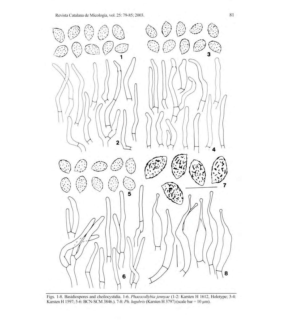 R EM ARK S. Thehabitandcolors of the basidi omes, sma ll-sized, e l1 ipsoidto s ubovoidba sidiospores, filam entous tocylindri c cheilocystidiaandclamples s hyphaeisaset offeatures thatdi stinguish this taxon. Macro-andmicroscopically, theSpanishmat erialsa re s im ilar w iththe Finni shs pecimens 161 2 and 159 7. Themicro scopic rc-examinati on of these twolatter sa rnples revealed: basidiospores 4 ,5-5,5 x 3 ,5-4 um(L x W: 5 ,0 x 3 ,6 Q = 1,39) andcheilocystidia ( 11-)13-28 (-32) x 1-2,5 um in s pecimen 161 2, m eanwhile in specimen 159 7 these we re 4 ,5-5,5 x (3 -)3 ,5-4 urn(L x W: 4 ,9 x 3 ,5 Q = 1,41), and (7- ) 10-24 x 1-2,5 (-3 ) um . Th e holotypeexhibits amorepoorIydeveloped ixocutis thantheothertwo samples;itiscornposed of cylindric tofilam entous, hyalin e toyellowish hypha e ( 1-)2-5(-6) umwid e, somewhat loosely arran ged, smoothtovariablyincrusted (fineto rathercoarse)andthenappearingmore pigmented. In col1ection 159 7, the pileipel1i s iss Iightly gelatini zed, althoughinterruptedandvariable indepth.Amongallthe samplescxamined , wefound aratherwidevariationinboththedegree of gelatinizationand thenumberand d istribution of incrustedhyphaealongtheepicuticularlayer.Thismakesthestratumappearthinorthickened , and 1110re incrustedoreven 1110re pigmented insomeareasthaninothers , inthesame col1ection. Wefoundthefollowing col1ection keptatKarsten herbariumunder N aucoria(christinae) j ennya e: Finnland.Mustiala , inpineto , 8.VIII.1866 , ¡ego e td et. P.A.Karsten No. 3797. Howe ver, important differencesincomparisonwiththeabove col1ections ex amincd areshownbythe amygdaliforrn to el1ipsoid , s omewhat stronglyverrucosebasidiospores 7 ,5-10 x 4 ,5-5,5(-6) um(L x W: 8 ,9 x 5 ,4 fJ.111 ; Q = 1,66), andthe lagenifonn , apical1y (1-2 ,5 umwide ) capitatedcheilocystidia ( 17-) 20-40 x 4-6 fJ.111 (figs. 7-8 and 12). Morphology of thedry basidiome s andtheobservedmicroscopic characterssuggestthatspecimen 3797 canbeinterpretedasa member of Ph.lugubri s (justas A.H. Smith highlightedinanoteaccompaningthis sampl e).