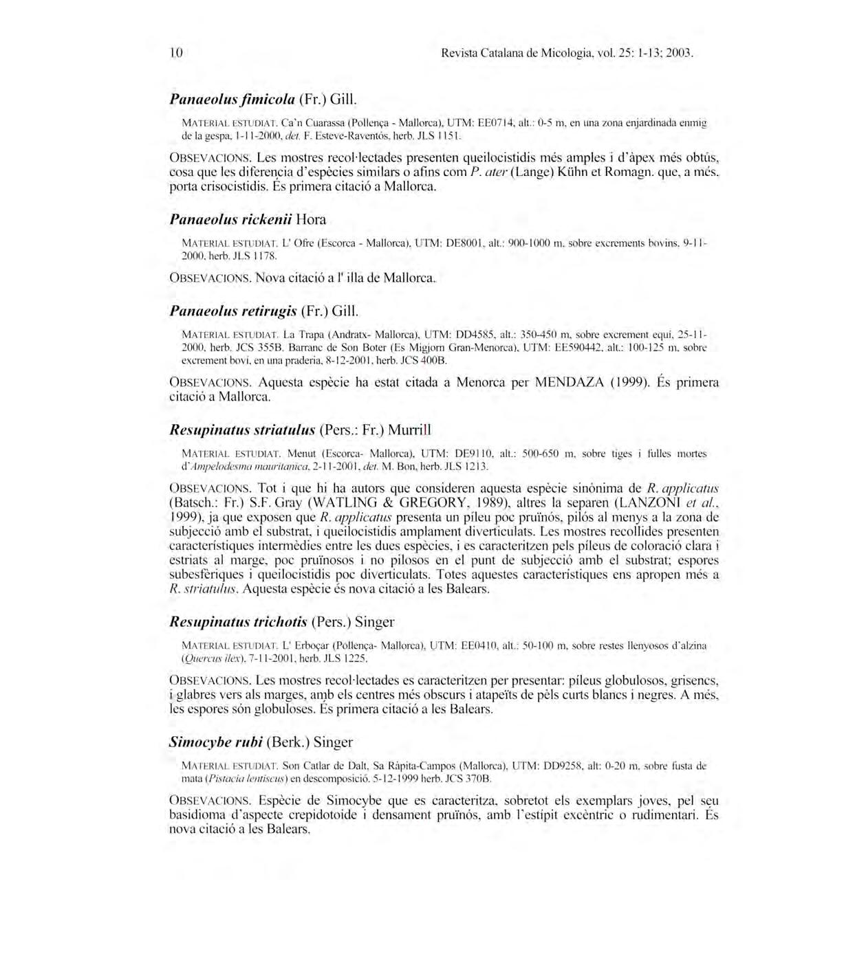 Lesespècieshanestatordenades , dinsdecadaclasse ,perordrealfabètic.A rn és portenlaindicació delaquadrículaUTM , altitudihàbitat d'on estrobaren.Quannoesmencionaexplícitament , els que hanrecol·lectatiidentificateltàxonsónelsautors.Sinoéselcas, s 'esmenta elrecol·lectordeltàxon oquil ' haidentificatoconfirmat.Totelmaterialdescritestàdipositatenelsherbarisparticulars dels autors(JLSiJCS) , iquanexisteixenduplicatsenaltres herbaris, s'indica onesconserven(FMR: FacultatdeMedicinadeReus).Lesobservacionsmicroscòpique ss'hanrealitzat amb unmicroscopi marcaOlyrnpusmodelBX40 , amb l'ajut delsreactiushabituals.