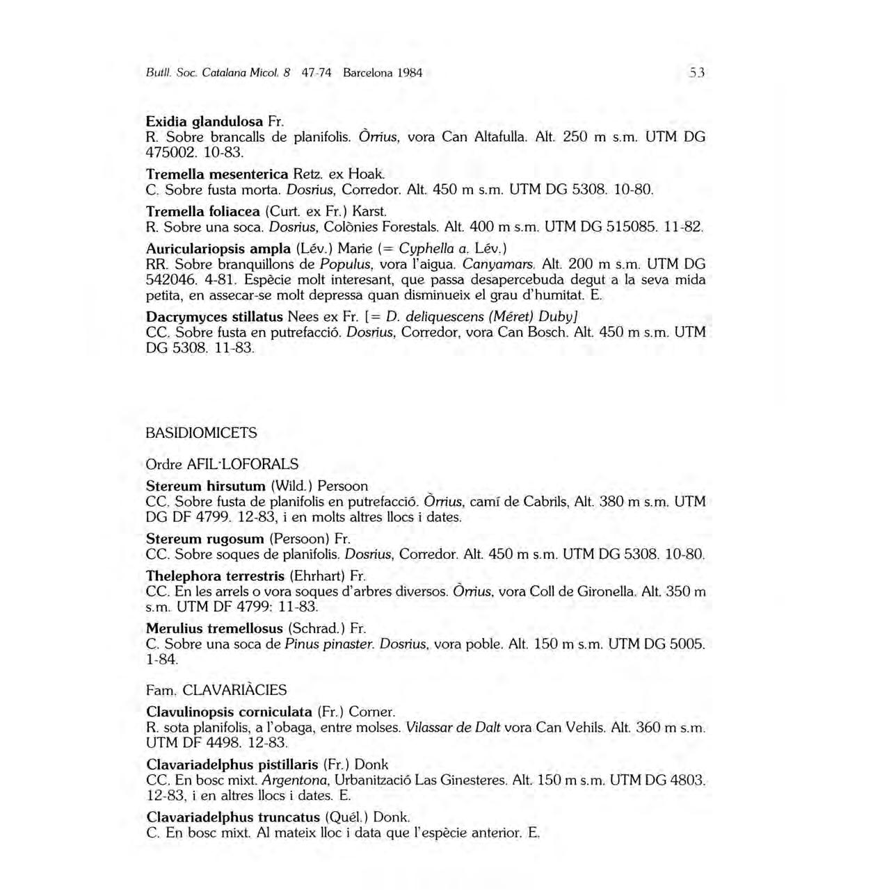 RR. Terranua , vora Quercus. Dosrius , CanBosc. Alt. 450ms.m . UTMDG 5307 . 7 -81, 8- 82,29-8-83. Trobat cada any únicament en aquest lloc. E. M. Mosersitua aquesta espècie e nlaFam . AgaricàciesFr.