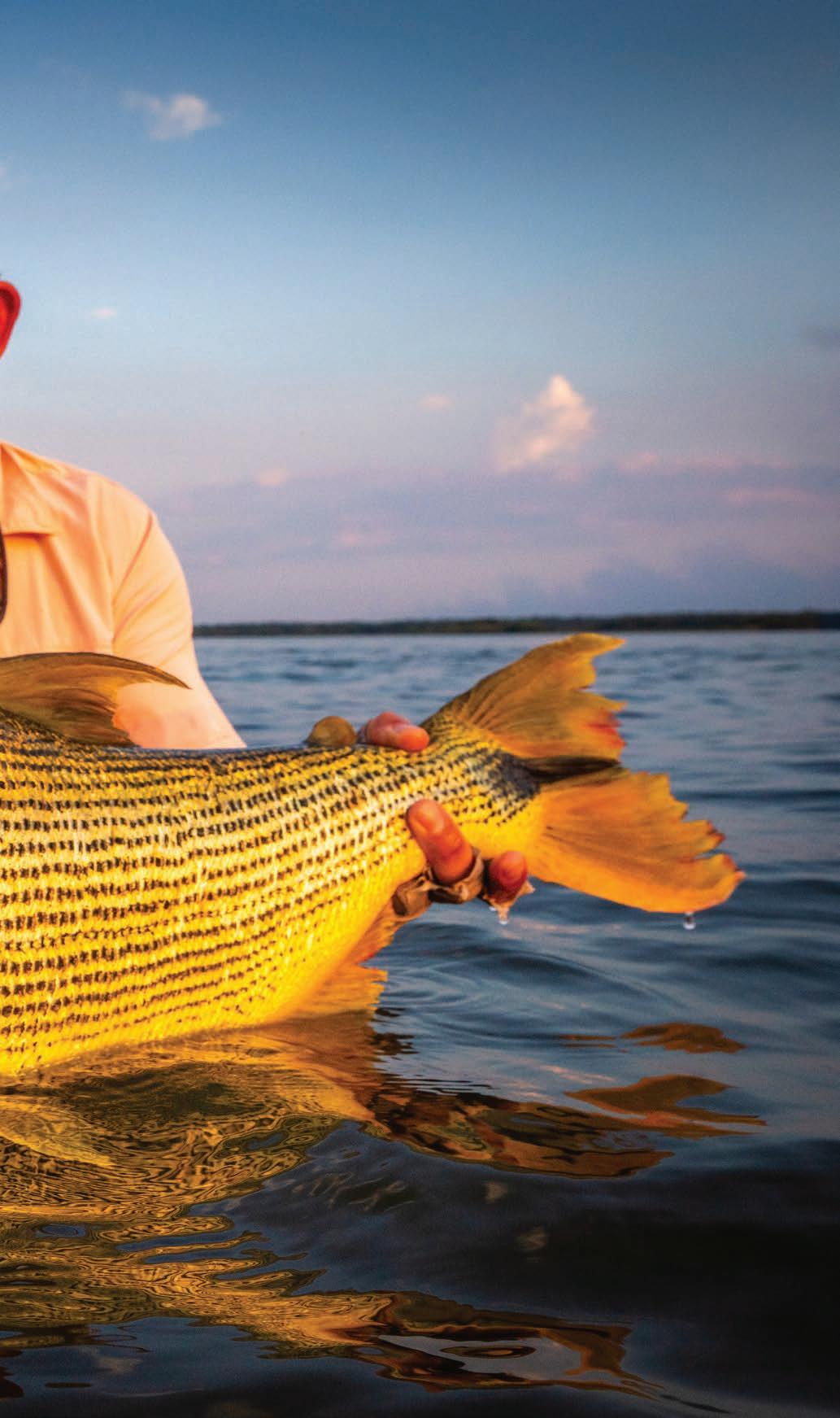 Without warning, the line comes up abruptly and savagely tight. I set hard and all the long hours of casting and retrieving are suddenly forgotten as a huge golden dorado, that my imagination has barely dared to conjure, clambers up into the last golden embers of the day.