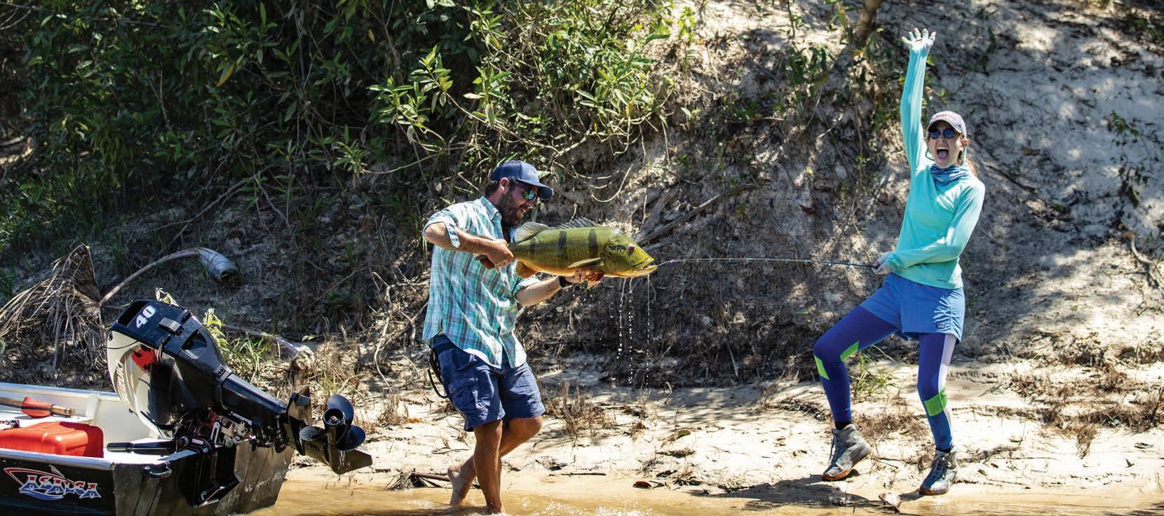 Flies are simple colourful silicon balls that mimic the various berries and fruits that tumble into the water from the bankside trees, and the technique is simply to drop your presentation close to the cruising Pacu and allow the ‘fly’ to free fall through the water column.