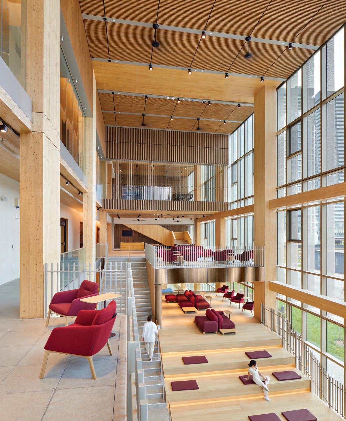 GEORGE BROWN COLLEGE’S 10-STOREY WATERFRONT ACADEMIC BUILDING IS A NEW KIND OF PUBLIC BUILDING: A MASS TIMBER TOWER PRIORITIZING RENEWABLE MATERIALS, OPERABLE WINDOWS, AND PLENTY OF DAYLIGHT AND FRESH AIR.