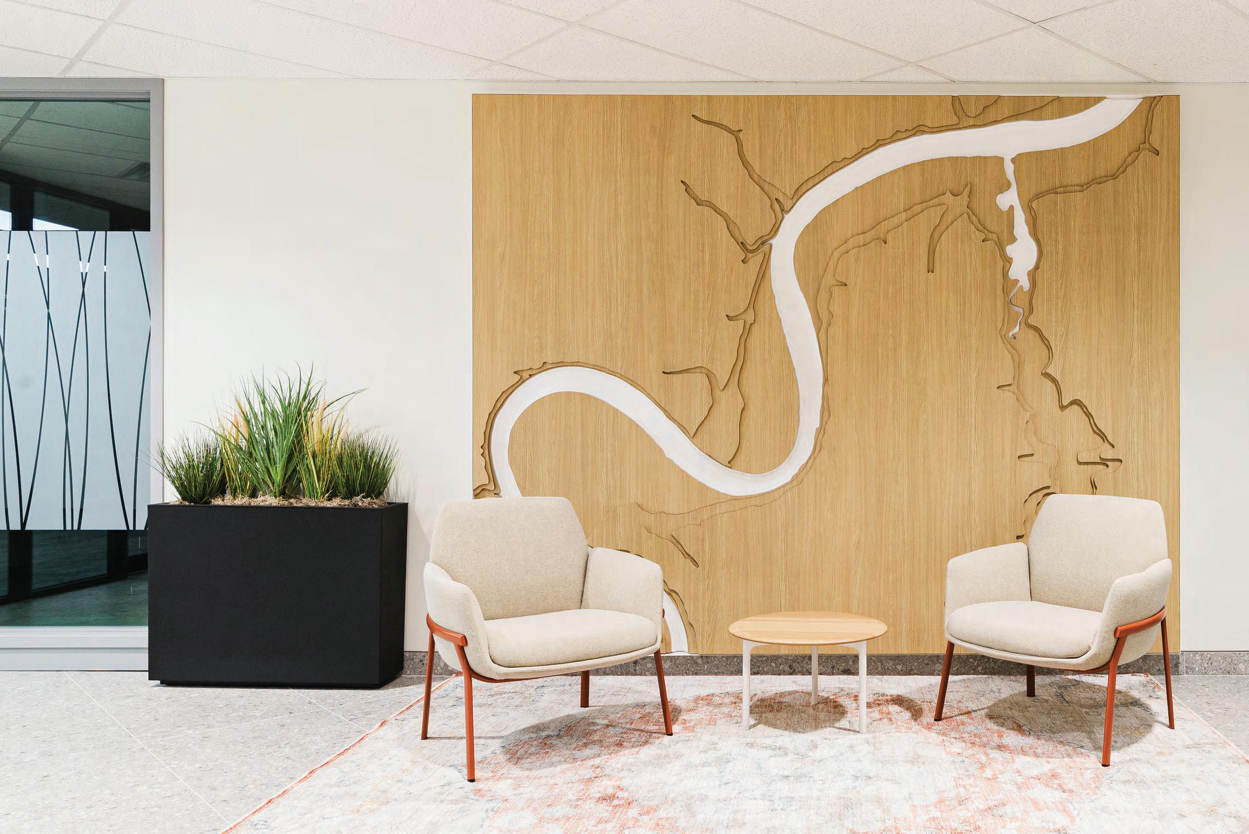 Making Waves To celebrate their 20th anniversary, real estate development company Mission Group built a new headquarters in downtown Kelowna, B.C. Prominent in the new space is The Wake of Change, an art installation symbolizing its connection to the Okanagan region. Inspired by looking up from beneath Okanagan Lake, wooden ribs on the ceiling mimic ripples left by a boat. These ribs transition into a 3D streetscape of vertical and horizontal shelves, mapping Kelowna’s evolution from Mission Group’s first lakefront project to recent developments. Crafted in walnut veneer, the piece integrates with structural elements like lighting and ductwork.