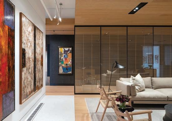 serviced by an executive kitchen. On the 40th floor, direct access to natural light serves as the common thread. Traditionally enclosed offices, in particular the ones at the building’s corners, have been turned over to quiet yet multi-functional meeting areas, with unassigned workstations throughout illustrating an embracement of the new era of flexible work. The quest for nice things continues in the materials palette, for which the designers didn’t have to look far. Locally sourced high-end materials were chosen wherever possible: floors are made of locally produced terrazzo tiles; work surfaces and wood panelling are made of locally sourced white oak; and 50 per cent of the furniture was sourced from Québec companies, with 40 per cent of the rest coming from other Canadian companies. Even Desjardins’ impressive art collection is primarily Canadian works. PS