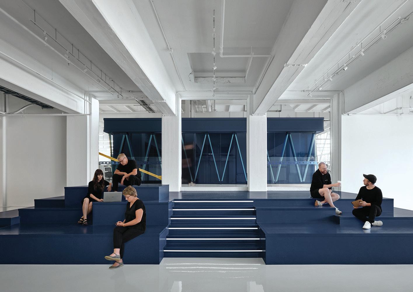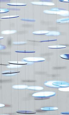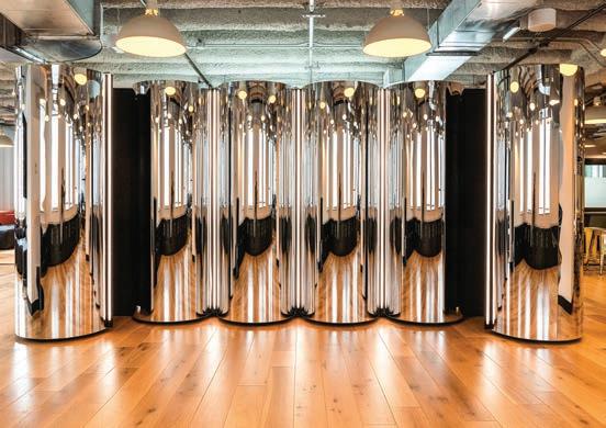 Peppered with offices for tech giants like Yahoo and Google plus dozens of start-ups, Kitchener-Waterloo is considered Canada’s Silicon North. In such a competitive atmosphere, workplace amenities are important to attract highly skilled workers. Created for the lobby atrium of a tech company’s new office building, Binary Spectrum is a site-specific, threestorey installation comprising 8,000 translucent acrylic discs in complementary warm and cool colours, suspended on 650 cables. The installation was created with parametric modelling software and expresses the yin-yang relationship of the tangible (representing the rich local history of manufactured goods) and intangible (representing the new digital realm), not to mention a sense of fun. The repetitive arrangement of the discs suggests digital processes and fractal patterns found in science. The faceted furniture was specified to co-ordinate with blue-coloured seating deployed within the lobby to offer multiple vantage points for viewing the installation. As people move in the atrium, the cables sway back and forth, animating this exuberant piece of eye candy. DL