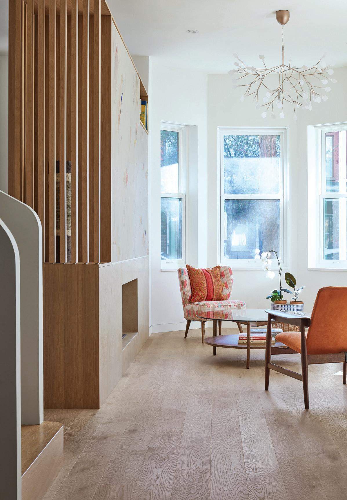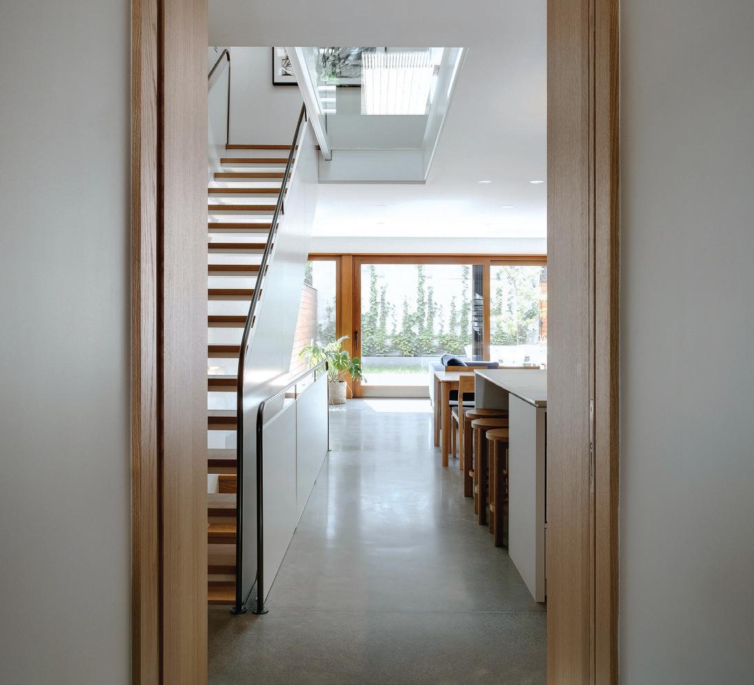 The heritage front on a Victorian semi-detached house in Toronto’s Annex neighbourhood barely hints at the renovation and expansion inside. The redesign of the 130-year-old, 2,500-sq.-ft. home involved a total overhaul of the interior, building a 440-sq.-ft. addition at the rear to enlarge the kitchen and accommodate three kids’ bedrooms on the second floor, and a newly built third-storey aerie for the relocated master bedroom. The crisply rectilinear front façade gives way to softly curving forms on the interior, influenced by the connection of the client, a ceramicist, to sculpture and pottery. Tactility and a sense of craft abound in details such as the smoothing of right angles and the choice of materials and fixtures. With its aesthetic of fluid lines, the house’s interior elements appear to have been sculpted rather than built, most evident in the corkscrew stairway which functions as a light tunnel, its three storeys illuminated by the skylight overhead. The rear elevation, clad in understated charcoal-toned cement board, steps back on multiple planes to disappear further among the lush plantings. DL