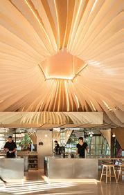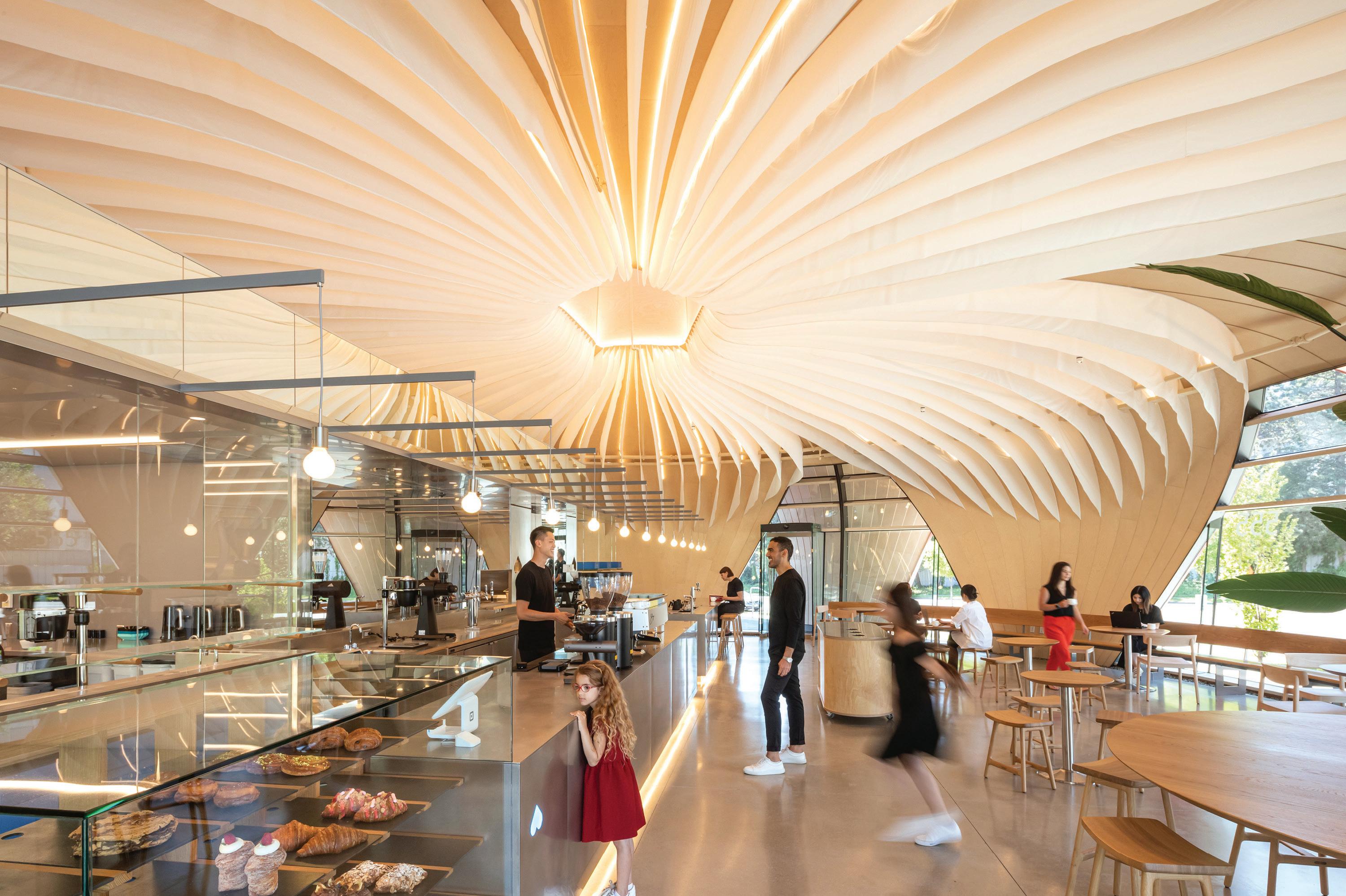 Situated on the Great Northern Way Campus in the False Creek Flats area, Perkins&Will created an office building and adjacent retail boutique known as the Red Pavilion, which acts as the front door to an emerging arts and design community. At the request of the pavilion’s occupant, Nemesis Coffeehouse, Perkins&Will also designed the interior space, which transforms from coffee shop in the morning to event space at night. The round structure comprises 10 CNC-cut birch plywood “petals” surfaced with red shingles, a metaphor continued inside with fins made of the gossamer fabric used in a photographer’s lighting soft box. Originating from a central oculus atop the structure and carrying soft LED strip lighting, the fins trace the plywood-petals’ “veins” while acting as acoustic baffles. When caught by a breeze, the rippling fins give the impression that the space is taking a breath. Reflective surfaces dematerialize the back-of-house pod while providing a gradient of visual transparencies: from low-iron vision glass displaying the coffee roastery, to one-way mirror glass partially obscuring the kitchen DL