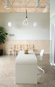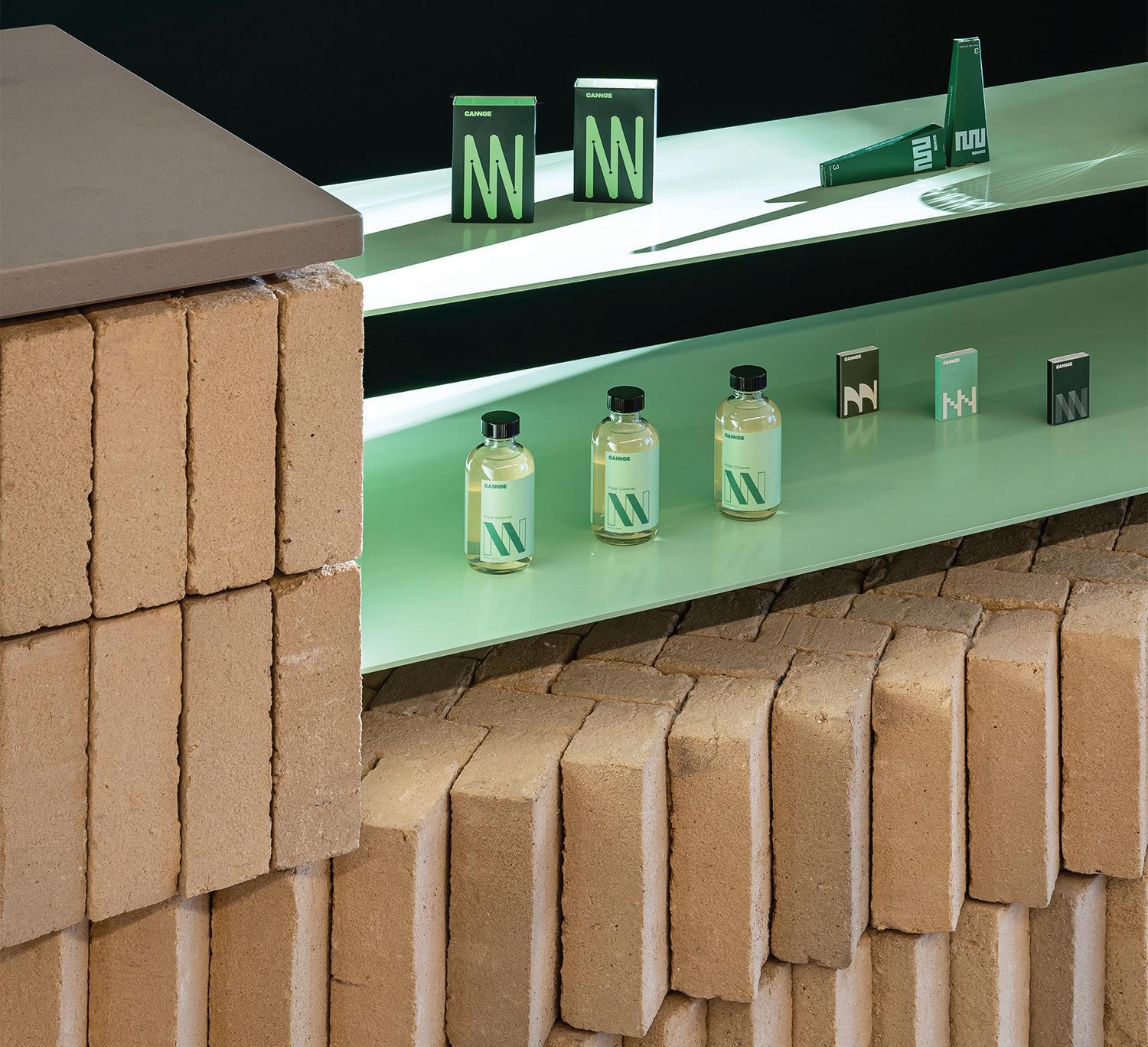 In a land where recreational cannabis shops outnumber bank branches and every shop sells the same provincially regulated product, design plays a crucial role in differentiating vendors and attracting customers. To enable cannabis supplier Cannoe to stand apart in its highly saturated market, the goal was to create a brand that integrates into communities to become as much a part of everyday life as the neighbourhood coffee shop. Williamson Williamson sought to make each Cannoe store contextual, with a unique palette anchored by the colour green. At the new location on Toronto’s Queen Street East, the buffcoloured brick bud bar makes a big statement with a nod to the building material of the area’s Victorian houses. The bricks’ modular size and sand-moulded solid body allows them to stack, twist and cantilever to create a curved seating area at the end of the bar and stepped and herringbone details at the linear areas of the counter. The warm brick complements the deep forest-green wall and light-green powdercoated shelving, giving a colour pop to the space. DL
