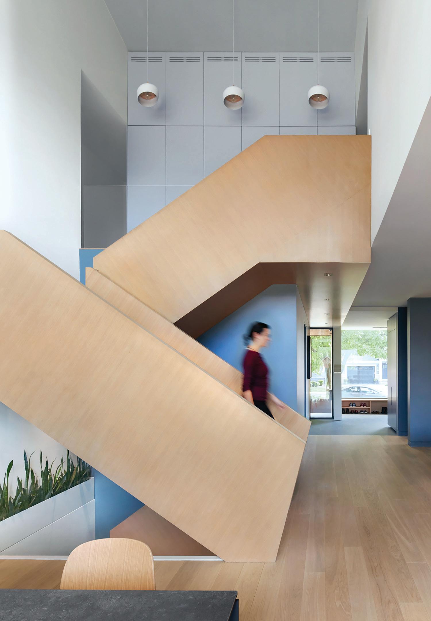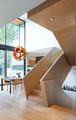 So-named for its sliding of rectilinear geometries within a grid, a play on solids and voids created opportunities for corner windows, generous roof overhangs and two balconies on the second floor that provide access to outdoor space. The glazed rear elevation connects the family to the surrounding environment, with a double-height atrium providing an expansive view of mature trees. An open plan where rooms flow gently into one another met the family’s request for a home meant for entertaining. Occupying the central core is a sculptural staircase defined by a solid balustrade of white oak and Baltic birch. Its scissor configuration forms a compelling three-dimensional geometric composition, animated by family members zigzagging up and down the stairs. The rift-cut blond wood and the varying blue contrasting walls are a nod to the clients’ love of Scandinavian design. The textural and tonal contrast of charcoal grey and Western red cedar cladding on the exterior carries through to the interior with white-oak floors and millwork; charcoal grey, black slate and walnut accents; and the grey-blue wall and furniture pieces. DL