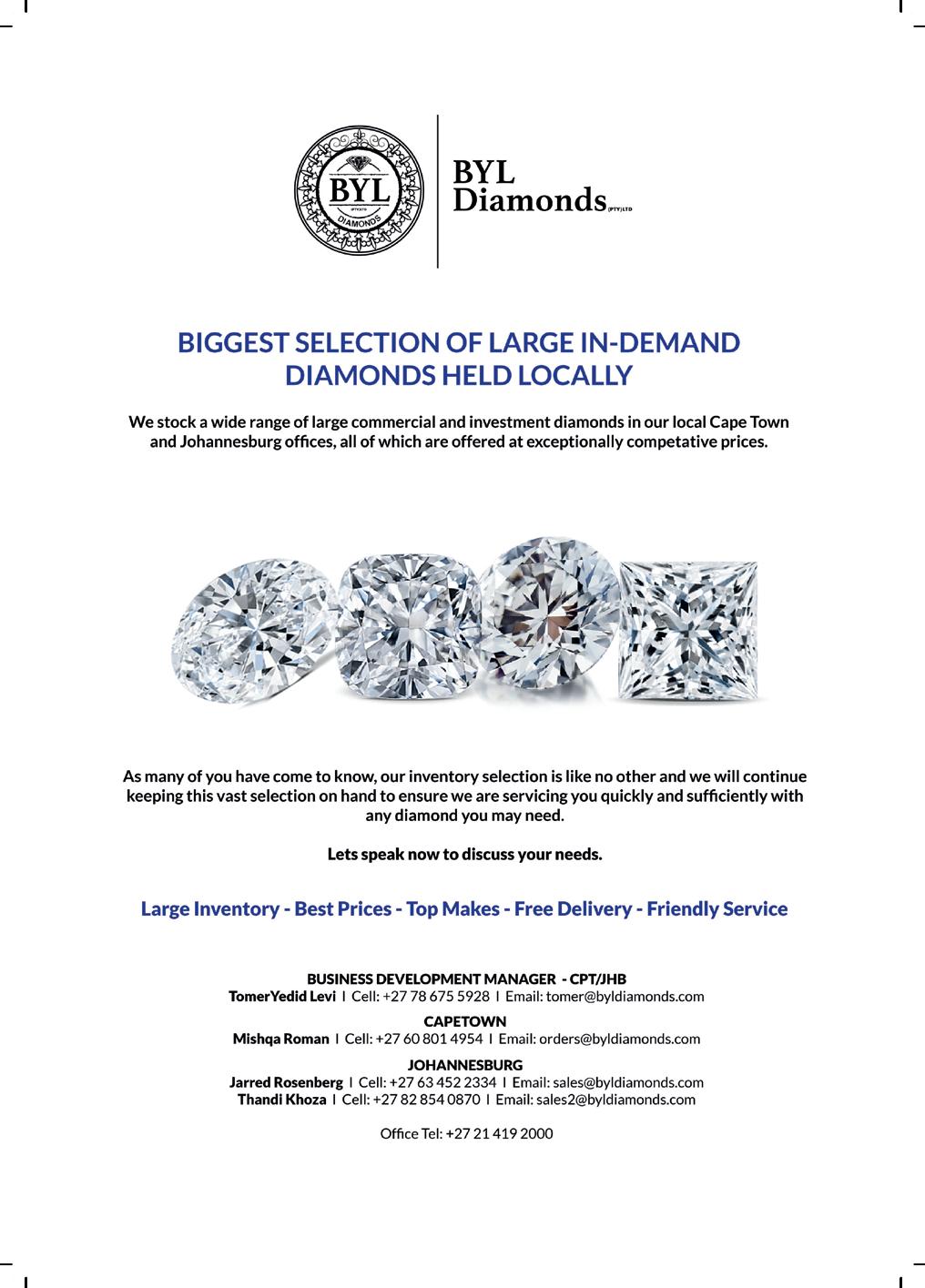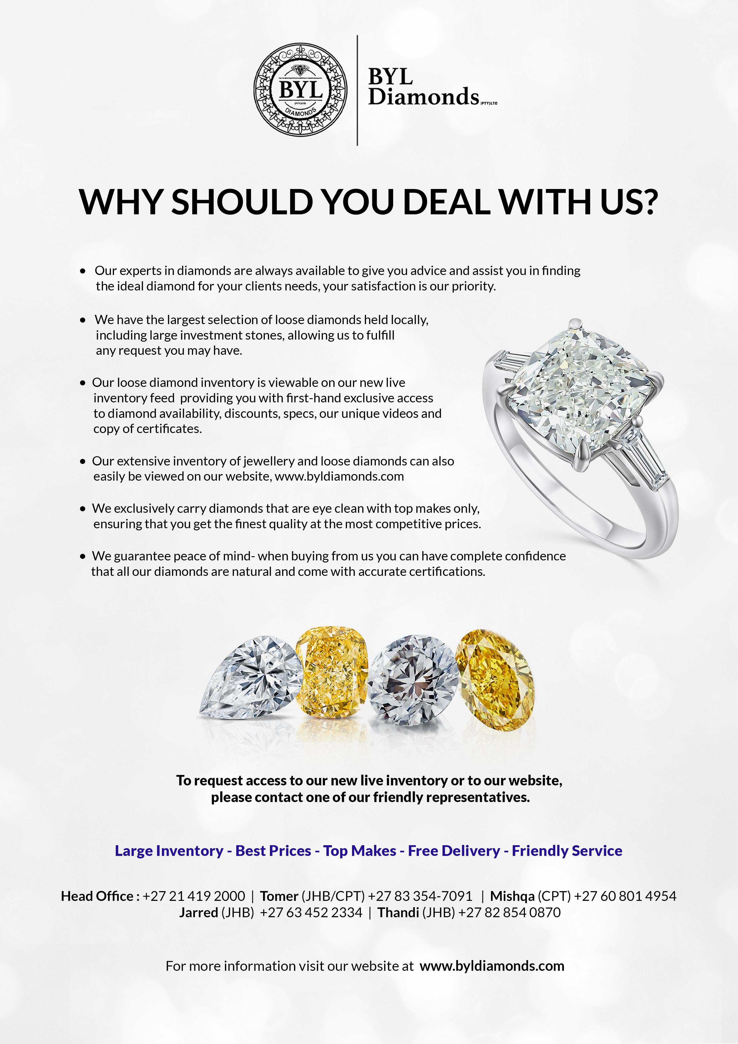 ever-changing jewellery range, with each piece made up using the finest diamonds and gemstones carefully chosen for each individual item. For more information on its range of diamonds, gemstones and jewellery collections, contact BYL Diamonds on tel: (021) 419-2000, e-mail: orders@byldiamonds.com or visit: www.byldiamonds.com.