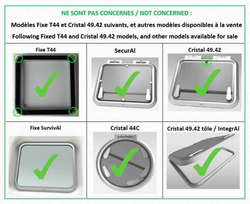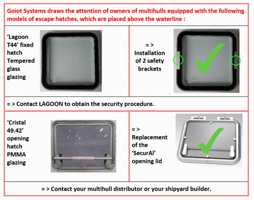Following a few cases of glazing failing to adhere to the aluminum frame, Goiot Systems has set up in 2020, for a limited time, securing kits or the replacement of opening hatches, with the shipyard manufacturers.