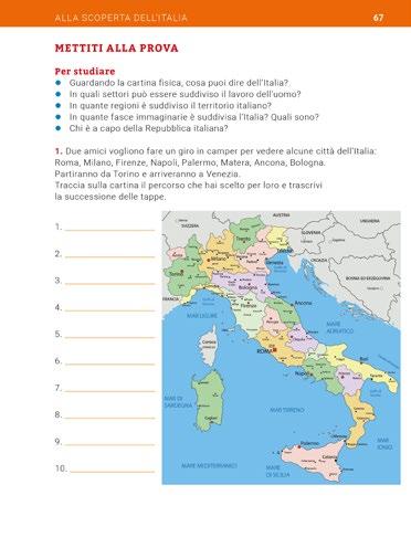 Riprendendo il metodo di lavoro proposto già nel volume di quarta, le regioni italiane sono state raggruppate a partire da comuni caratteristiche morfologiche nei seguenti gruppi: le regioni dell’arco alpino (Val d’Aosta, Piemonte, Liguria, Trentino Alto Adige, Veneto, Friuli Venezia Giulia); le regioni dell’Appennino dal mar Tirreno all’Adriatico (Toscana, Umbria, Marche); il versante sull’Adriatico (Abruzzo, Molise, Puglia) più a Sud (Sardegna, Campania, Basilicata, Calabria). Le cartine politiche introduttive dell’Italia e quelle delle «fasce» appena nominate presentano volutamente solo il nome delle regioni prese in esame, i rispettivi capoluoghi e il posizionamento nella penisola; ciò sta a indicare un livello essenziale, perciò irrinunciabile, di conoscenza. Per questo nella sezione Mettiti alla prova è sempre presente una proposta volta a verificare il livello di conoscenza del territorio italiano.