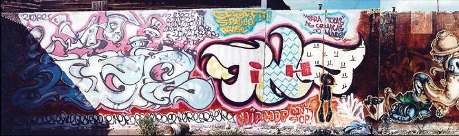 uma grande referência feminina na cultura hip-hop. Atualmente, segue pintando nas ruas, atuando como educadora de graffiti em espaços culturais e vendendo projetos de arte. Apesar de ser uma das minhas grandes influências, ela não foi a primeira referência, já que, no início do meu percurso, a internet era uma ferramenta limitada, à qual nem todo mundo tinha acesso, e as primeiras mulheres com as quais tive contato encontrei na rua.