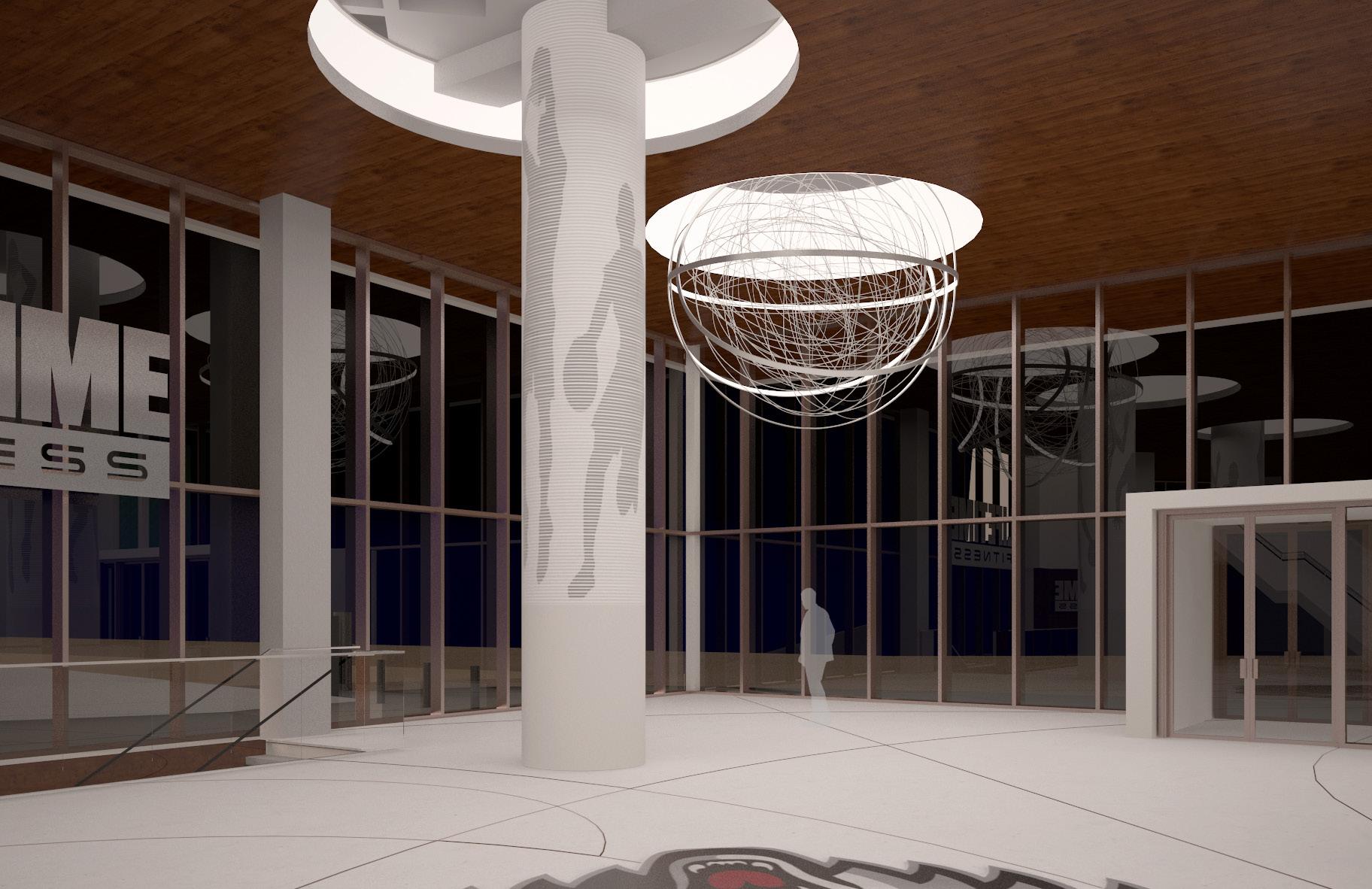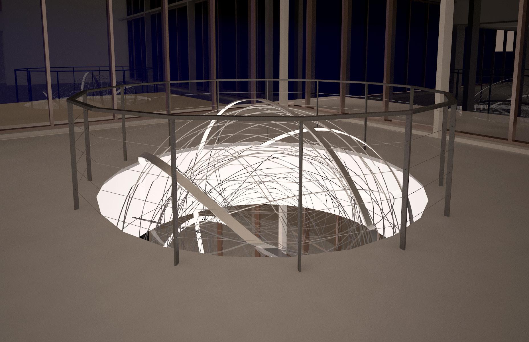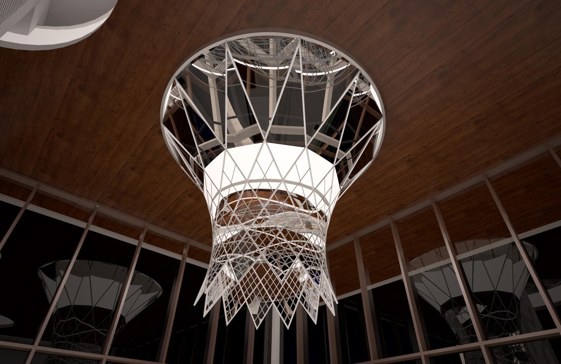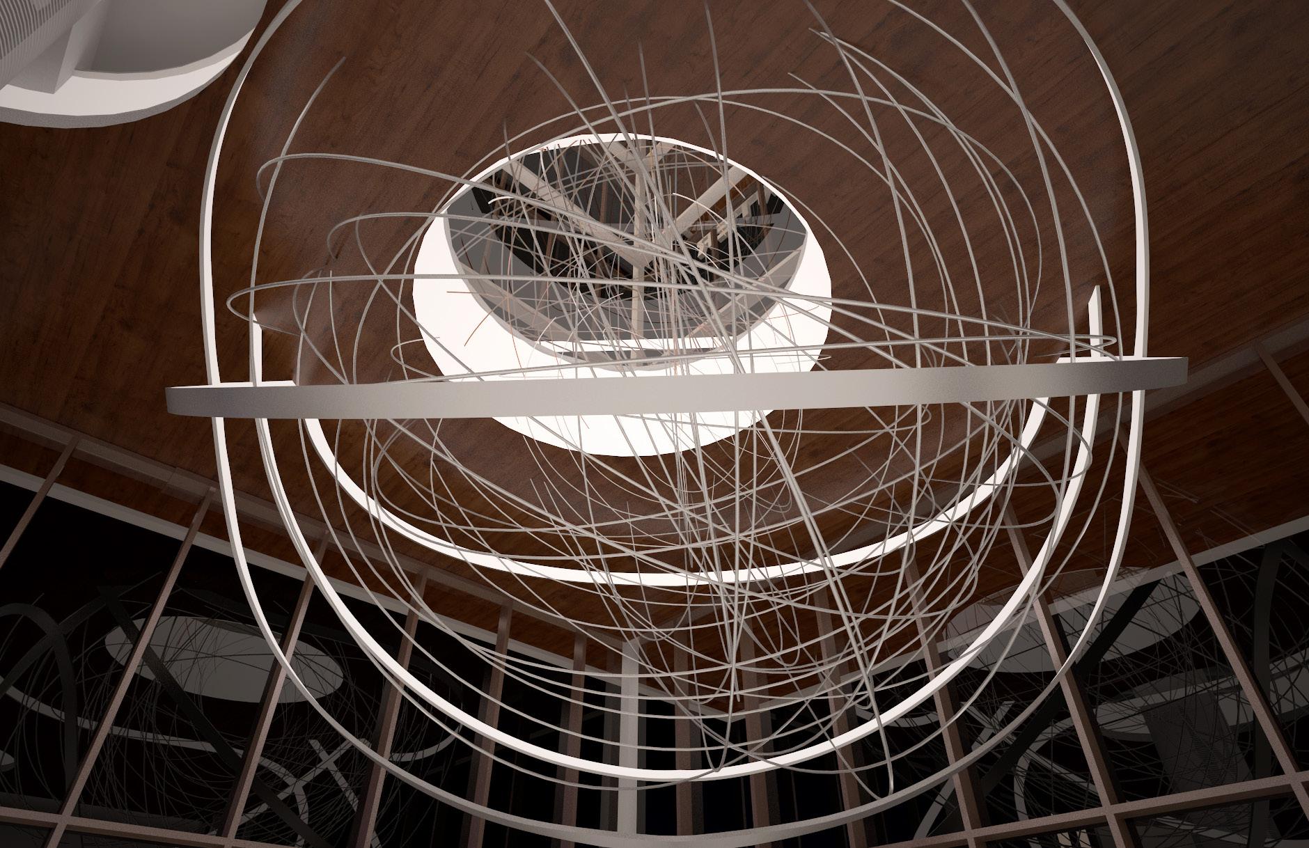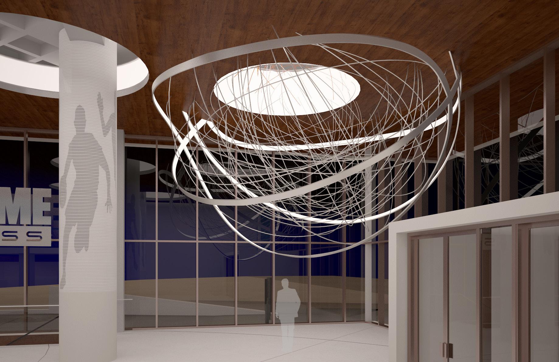 Spherical formed in clear acrylic and silver mirror metal strips. A very evocative piece that can be customized The basketball could be made out of 3" rolled round aluminum tubes that would look similar to a net. The intent is paper mache but with big aluminum pipes. This concept would pertain lights and provide a light tray at floor opening.