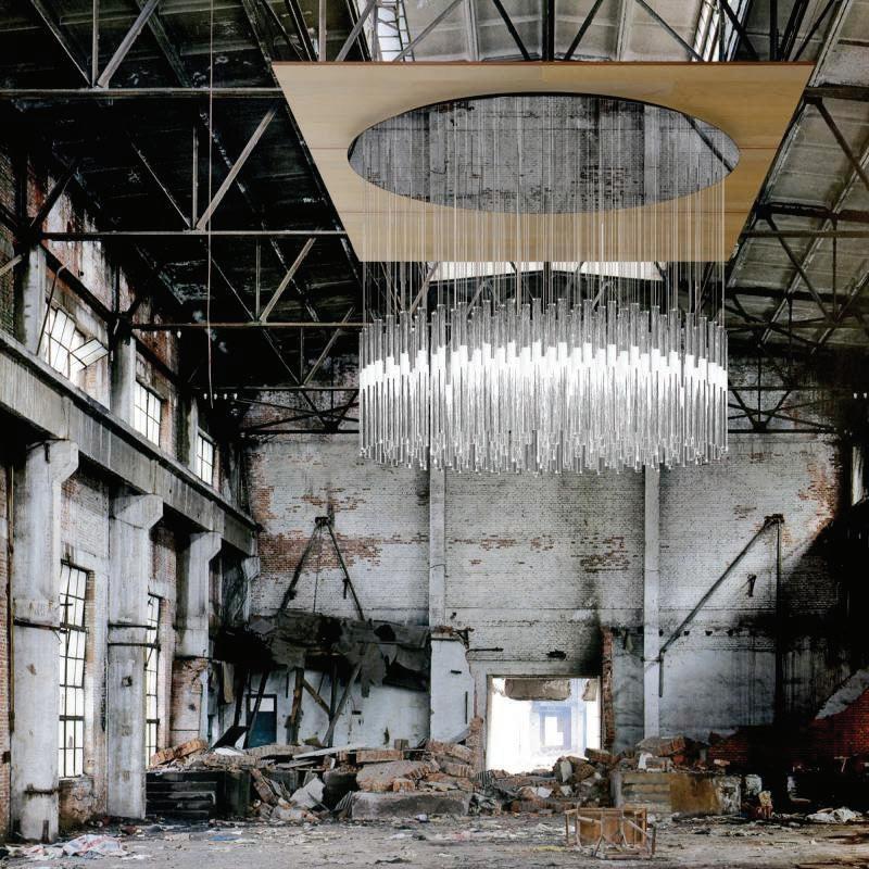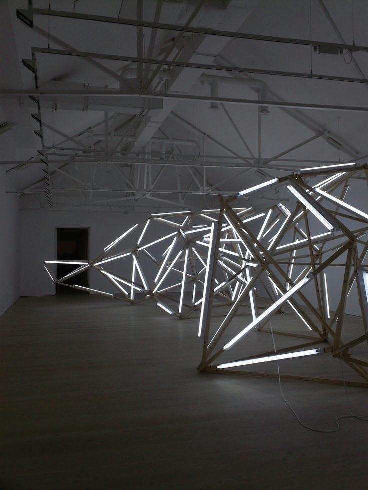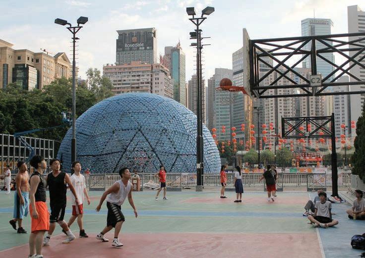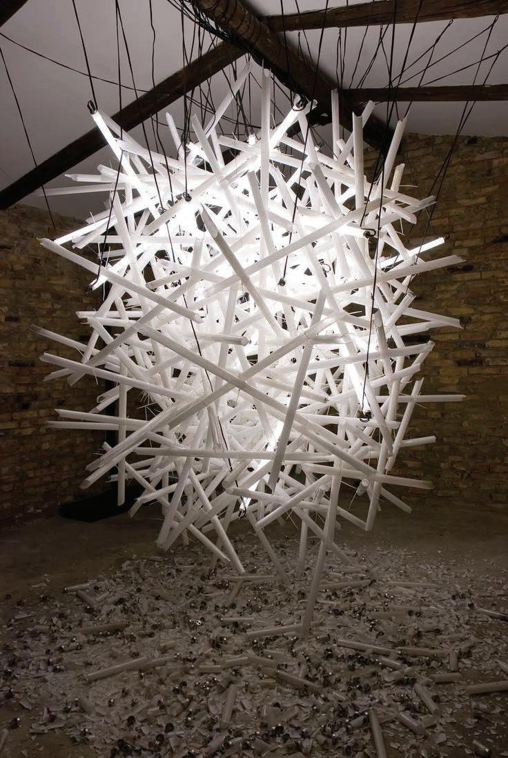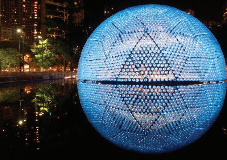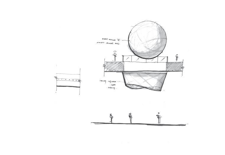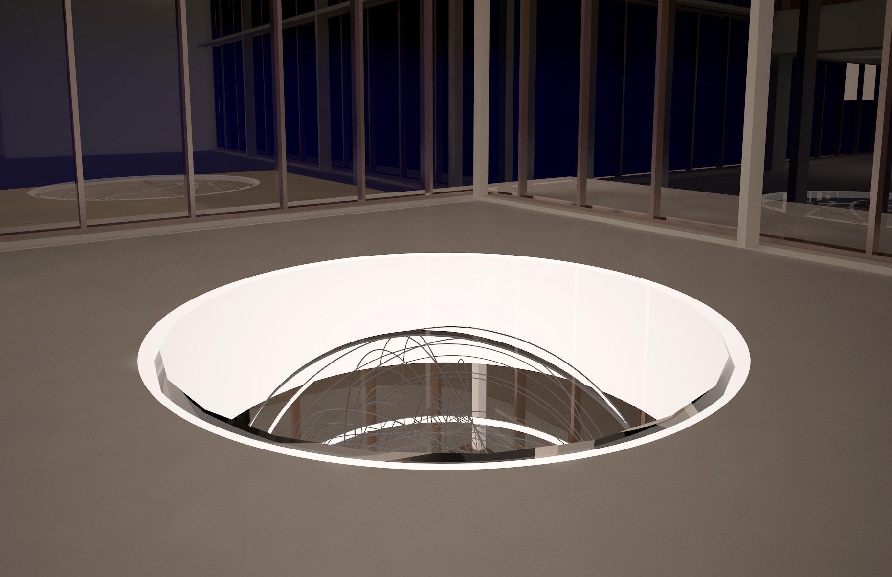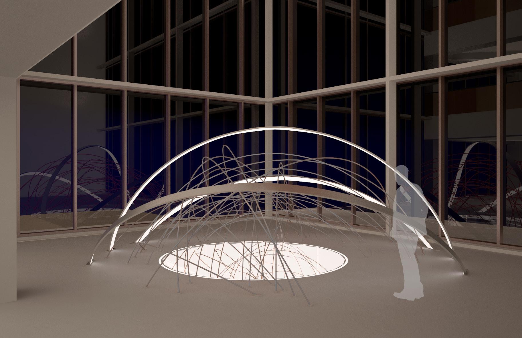 Spherical formed in clear acrylic and silver mirror metal strips. A very evocative piece that can be customized The basketball could be made out of 3" rolled round aluminum tubes that would look similar to a net. The intent is paper mache but with big aluminum pipes. This concept would pertain lights and provide a light tray at floor opening.
