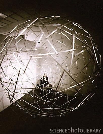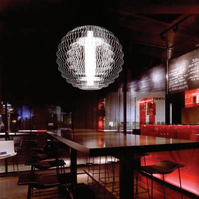 Spherical formed in clear acrylic and silver mirror metal strips. A very evocative piece that can be customized