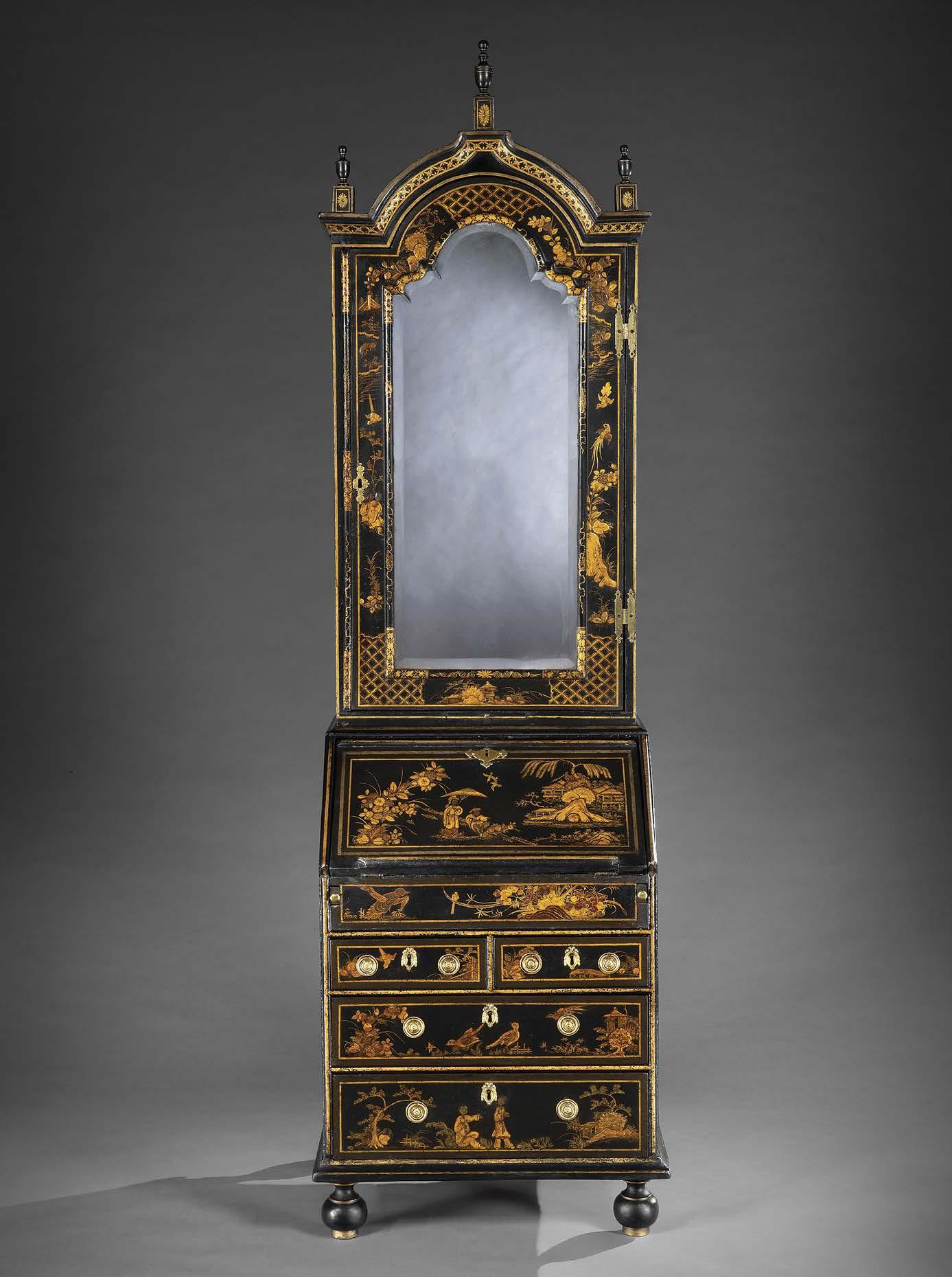 A fine Queen Anne black japanned bureau cabinet of rare small proportions. The upper section with an arched cresting above a single hinged door fitted with the original bevelled mirror plate opening to reveal shelves, pigeon-holes and small drawers. The lower section incorporating a bureau with a writing slope, pigeon-holes, drawers, and secret compartments, all above two short drawers over two long drawers, standing on bun feet.