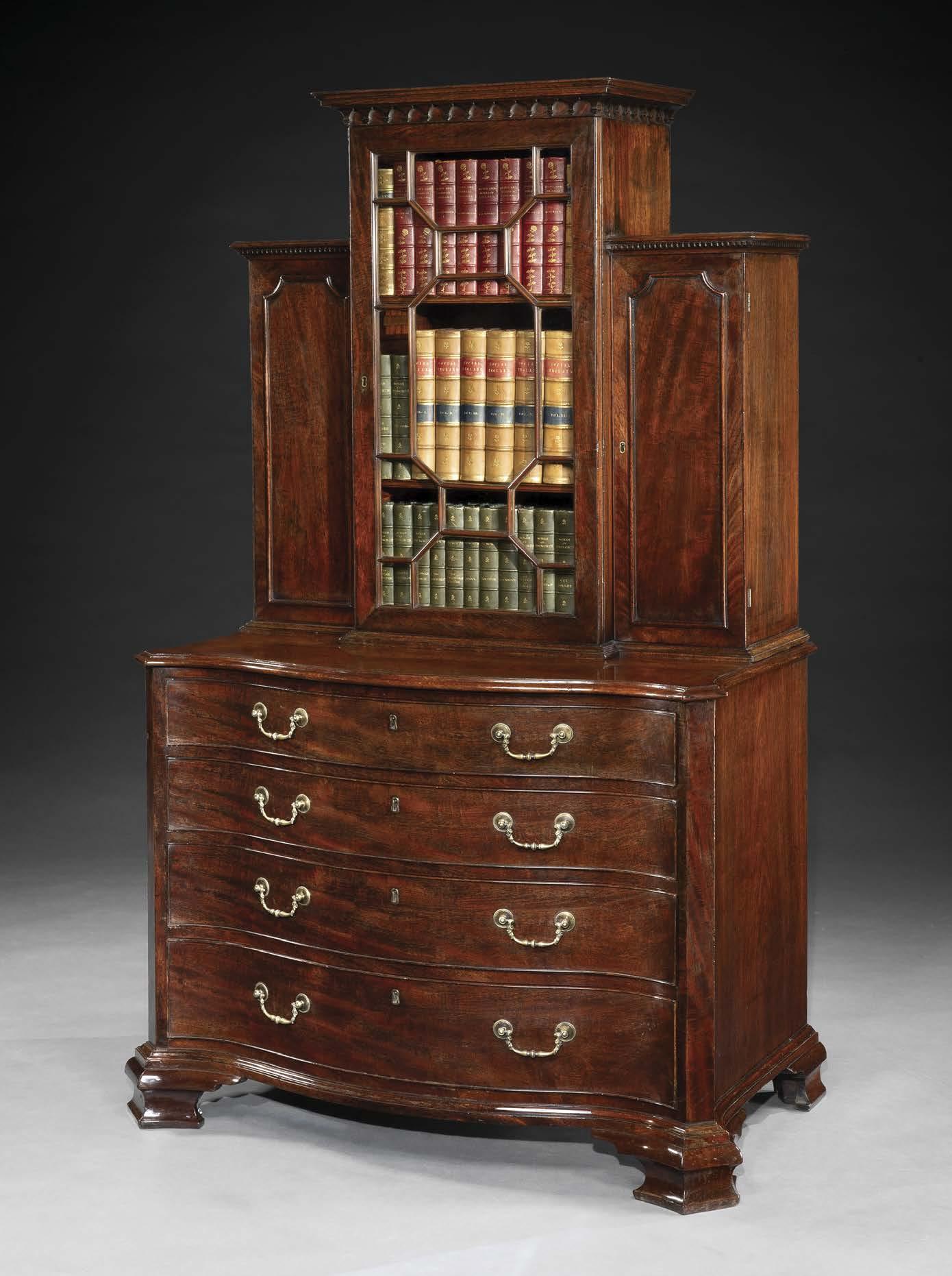 A very fine and rare George III Chippendale period mahogany dressing chest- cabinet. The upper section with central glazed display cabinet with a moulded plinth with arcaded cornice, flanked by two mahogany cupboards with fielded panels each opening to reveal six pigeon-holes and a bank of four graduated mahogany lined drawers each with brass axe-head handles. The lower section in the form of a serpentine chest of drawers, with moulded edge, four graduated full width drawers and bold bracket feet. The top drawer fully fitted with brushing slide, a mirror on a ratchet mechanism and numerous compartments.