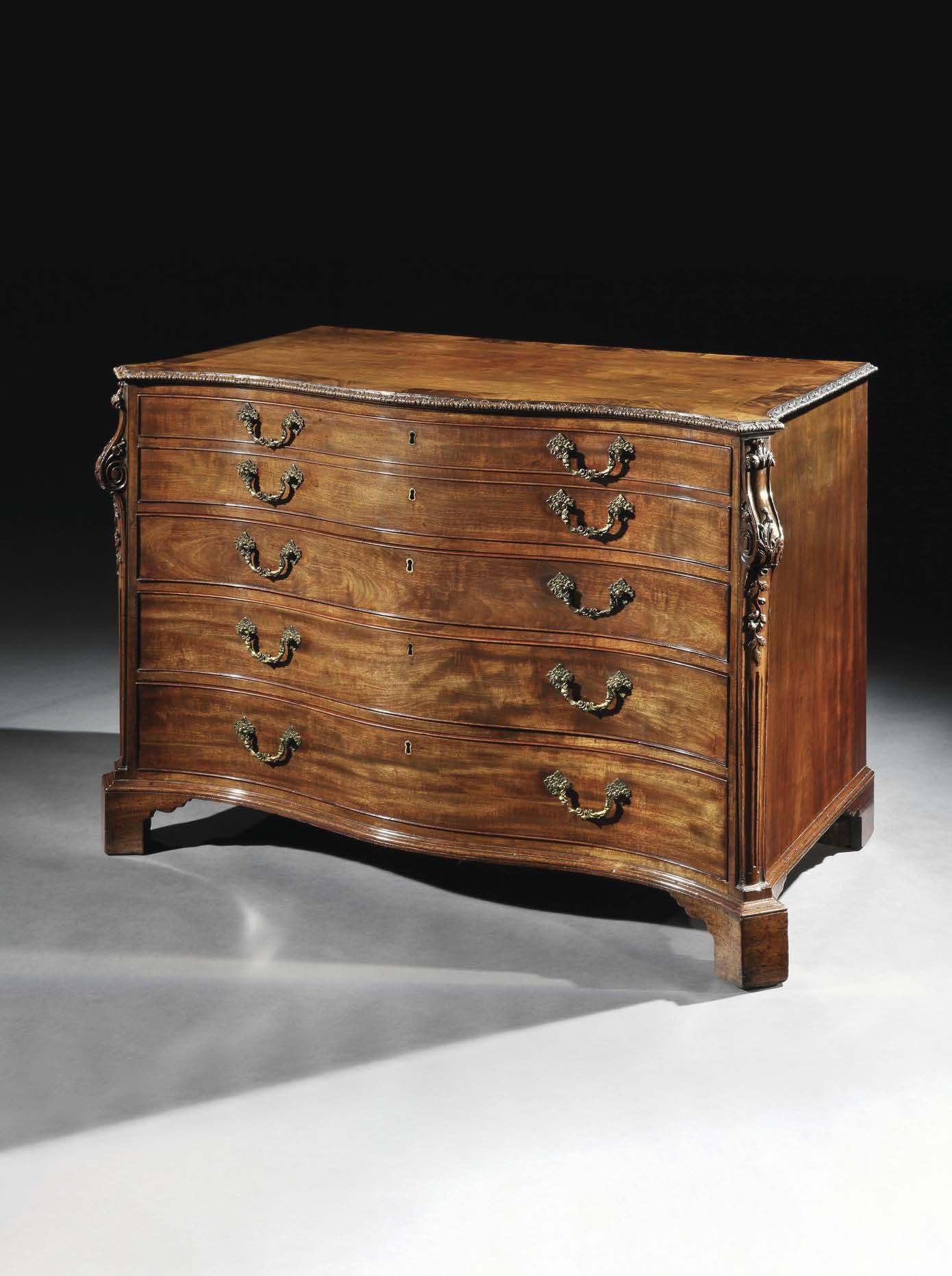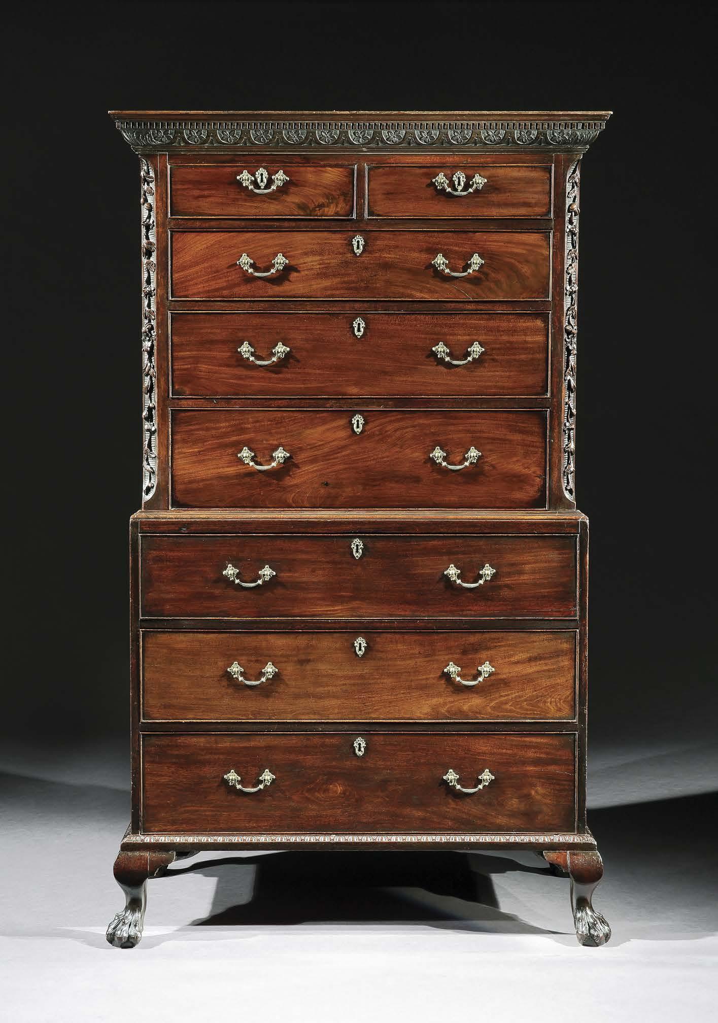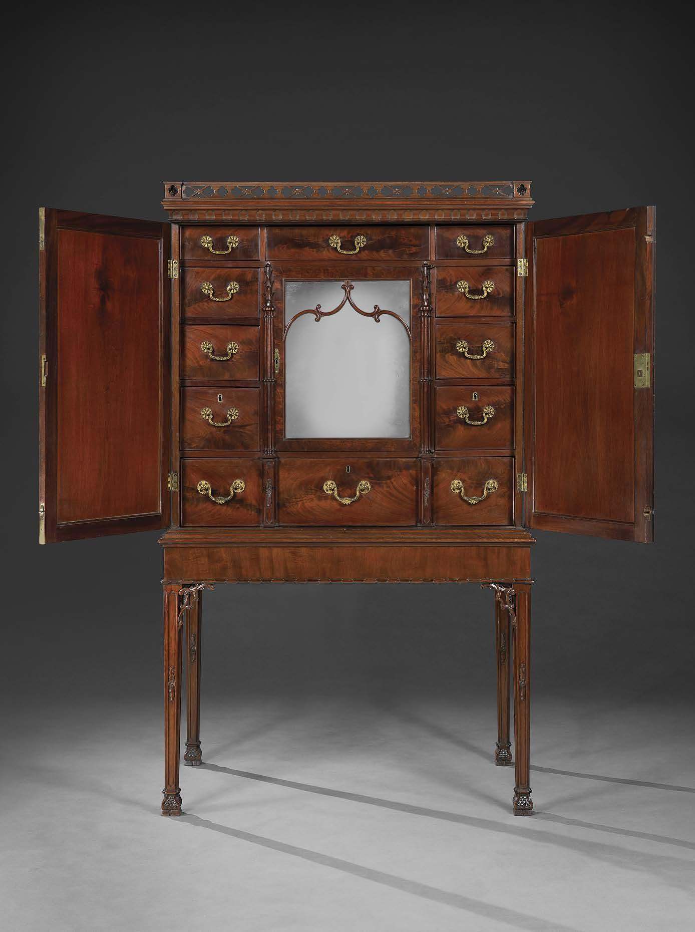 This superb piece of 18th century cabinet-furniture bears many features typical with those on documented Chippendale pieces, making an atttribution to Thomas Chippendale highly plausible. In particular, comparisons can be made to some of the furniture supplied to Ninian Home for Paxton and to Lord Dumfries for Dumfries House.