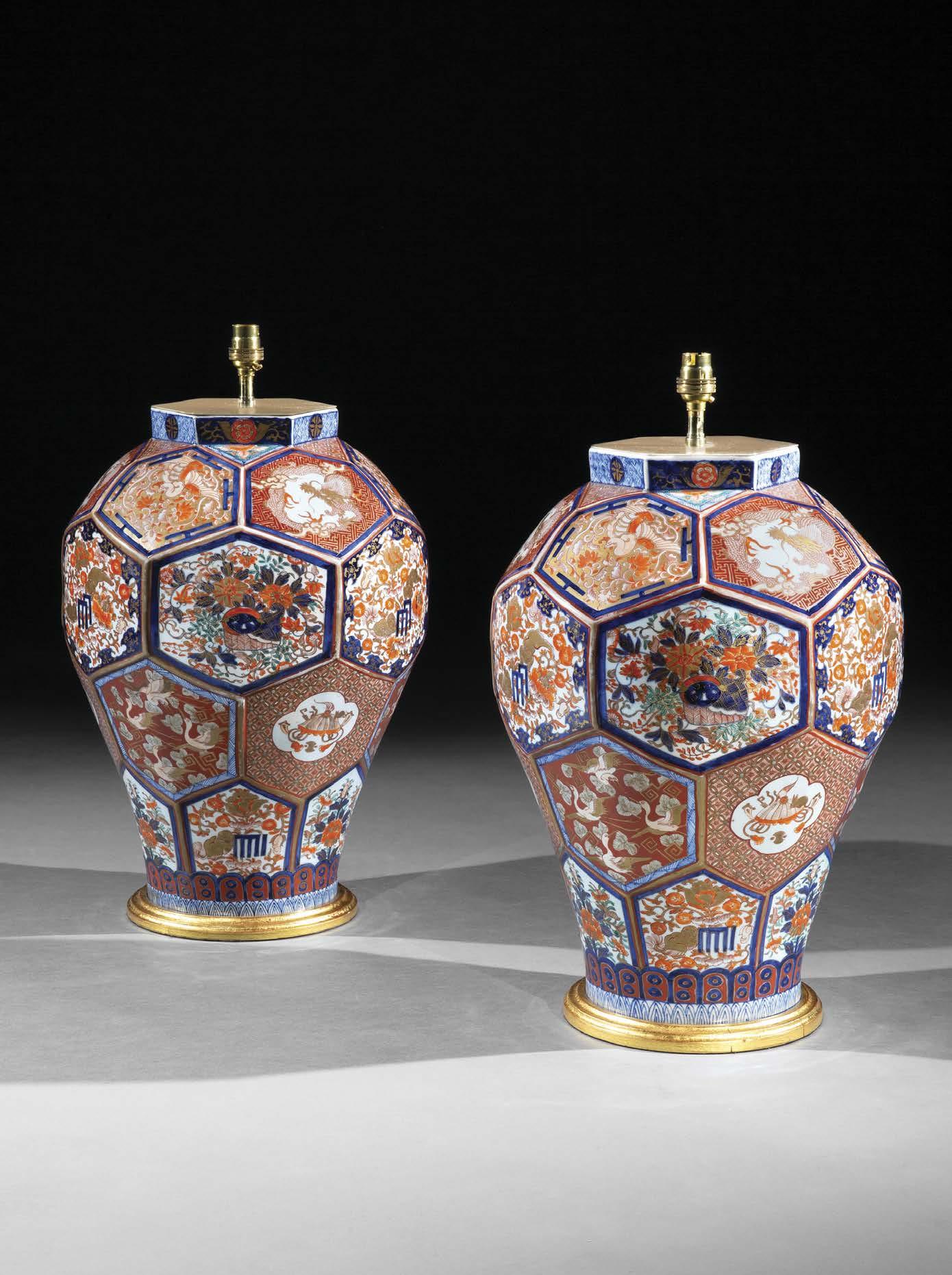 An exceptional pair of large late 19th century Japanese vases, decorated in the typical Imari palette of iron reds and blues on a white background with gilded highlights, now mounted as lamps with hand gilded turned bases. Of large scale with rare, facetted panel decoration and superb painted detail.