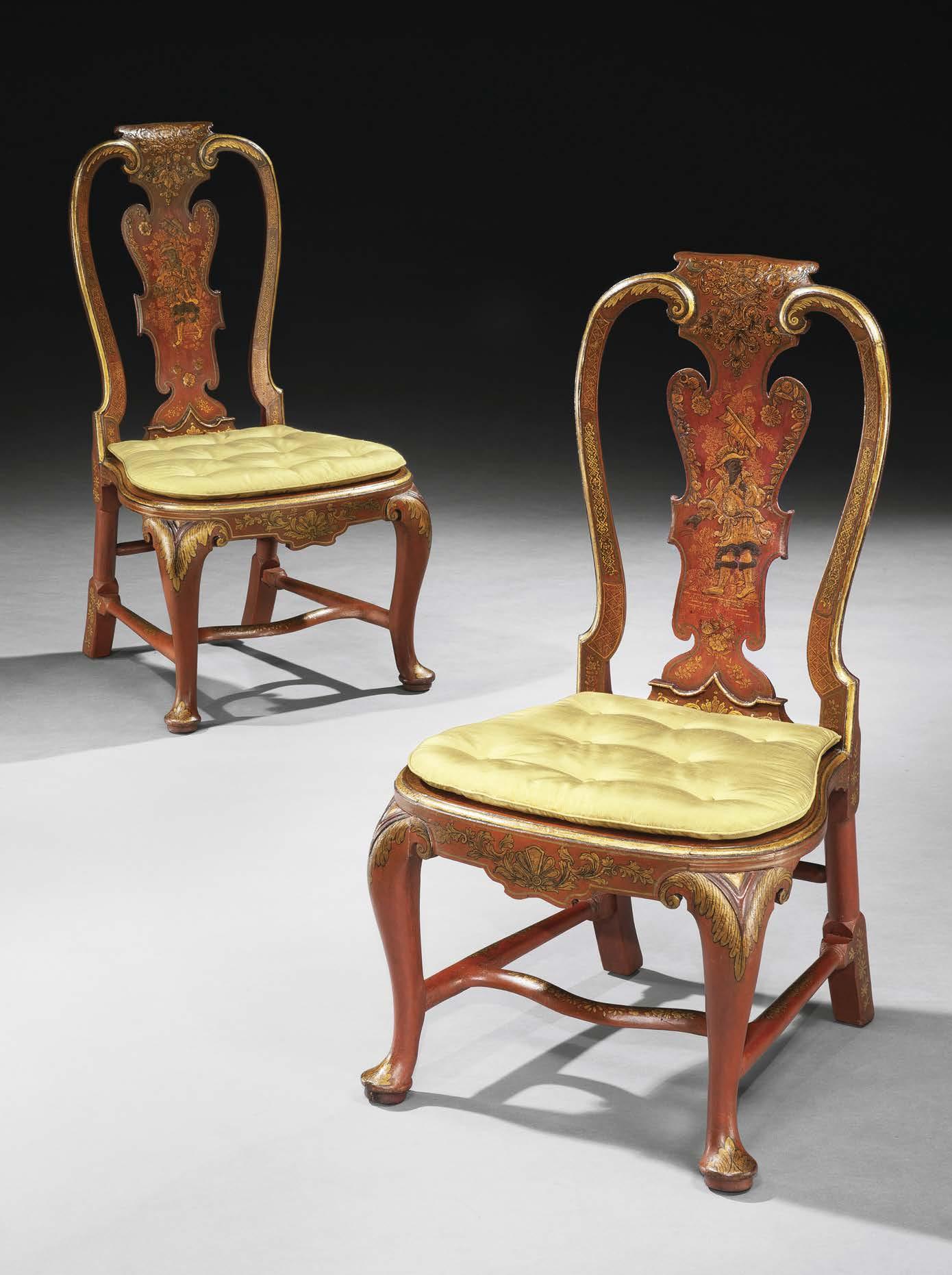 These iconic chairs form part of the most celebrated and elaborate suite of English furniture made during the 18th century. Commissioned from the esteemed London cabinet-maker Giles Grendey, this extensive suite comprises at least seventy-seven scarlet japanned pieces including tables, chairs, daybeds, looking glasses, tripod stands, and several desks and bookcases, part of which can now be found in museums worldwide including the Victoria & Albert Museum in London and the Metropolitan Museum of Art in New York.