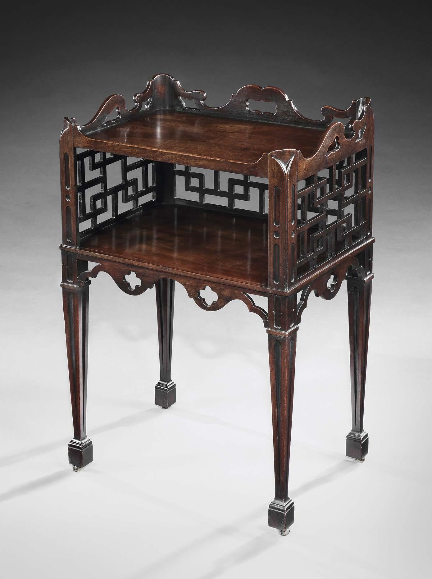 Grendey’s most important recorded commission was the celebrated Lazcano Palace scarlet japanned furniture from the collections of the Dukes of Infantado – arguably the most elaborate suite of English furniture made during the 18th century. Commissioned specifically for export to Spain, the ensemble comprised at least seventy-seven pieces including tables, chairs, daybeds, looking glasses, tripod stands, and several desks and bookcases. Pieces from this suite can be seen in leading museums including the Victoria & Albert Museum in London and the Metropolitan Museum of Art in New York. For examples from this suite please see pages 106-107 of this catalogue.