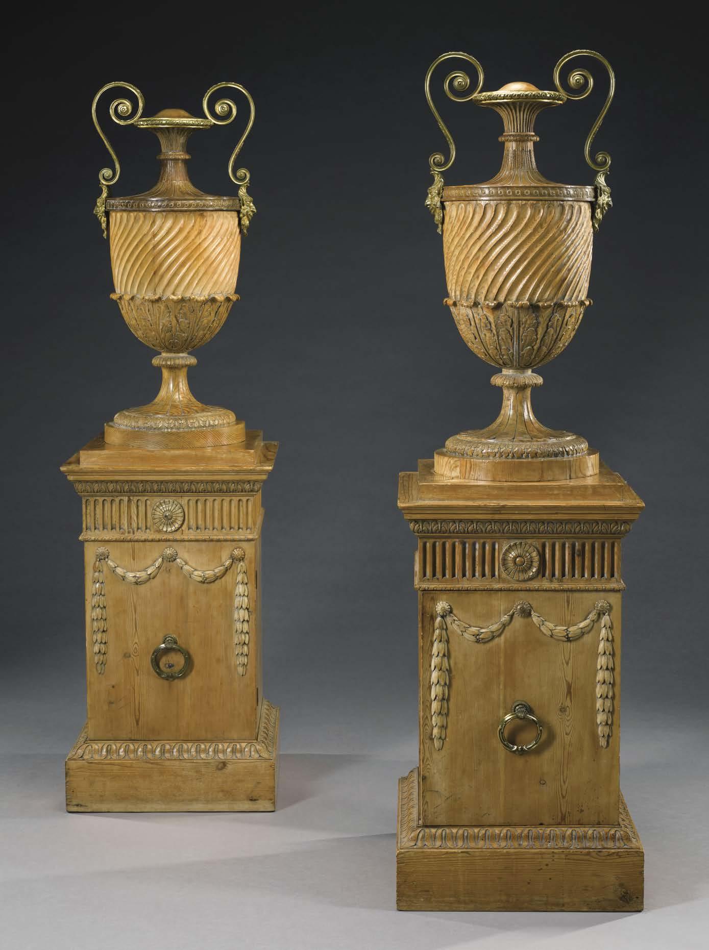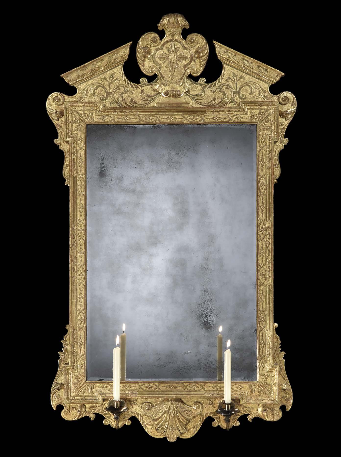 Of particular note is the outstanding pair of urns and pedestals supplied by John Linnell and designed by Robert Adam for Shardeloes in 1766, the exceptional pair of rococo armchairs from the Earl of Derby’s collection at Knowsley in Lancashire and the magnificent neo-classical table from Boynton Hall – the provenance of which has only now been pieced together. We include a pair of scarlet japanned side chairs by Giles Grendey from the celebrated Lazcano suite, a giltwood settee from Powerscourt, a pair of chairs from Chesterfield House and the extraordinary pair of oyster veneered mirrors from the Long Gallery at Chirk Castle. The eight George I walnut side chairs previously at Dumbarton Oaks are also particularly noteworthy.