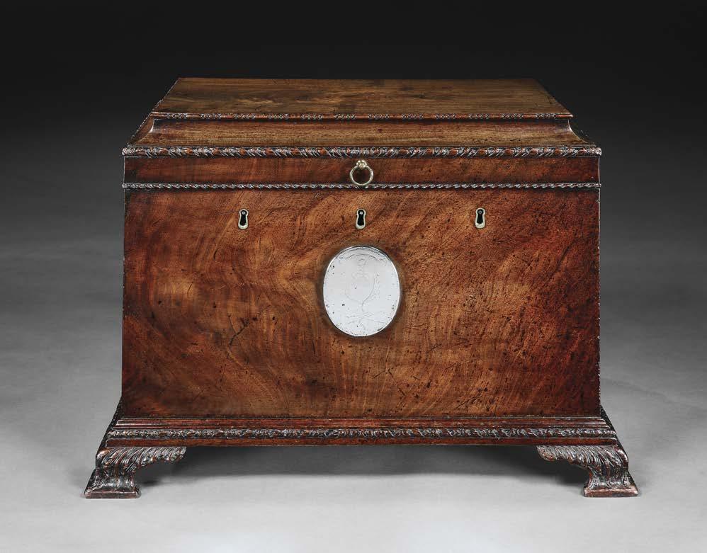 An exceptional George III mahogany strong box. Of rectangular form, the figured veneered hinged top with an incurved moulding edged with bead-and-reel, gadrooning, and rope carving, above a conforming case fitted with three locks and heavy brass carrying handles with shaped flat back plates. The front panel inset with a silver plaque with an engraved coat of arms. The base with ribbon and rose-carved mouldings, supported on shaped bracket feet with foliate gadrooned detailing.