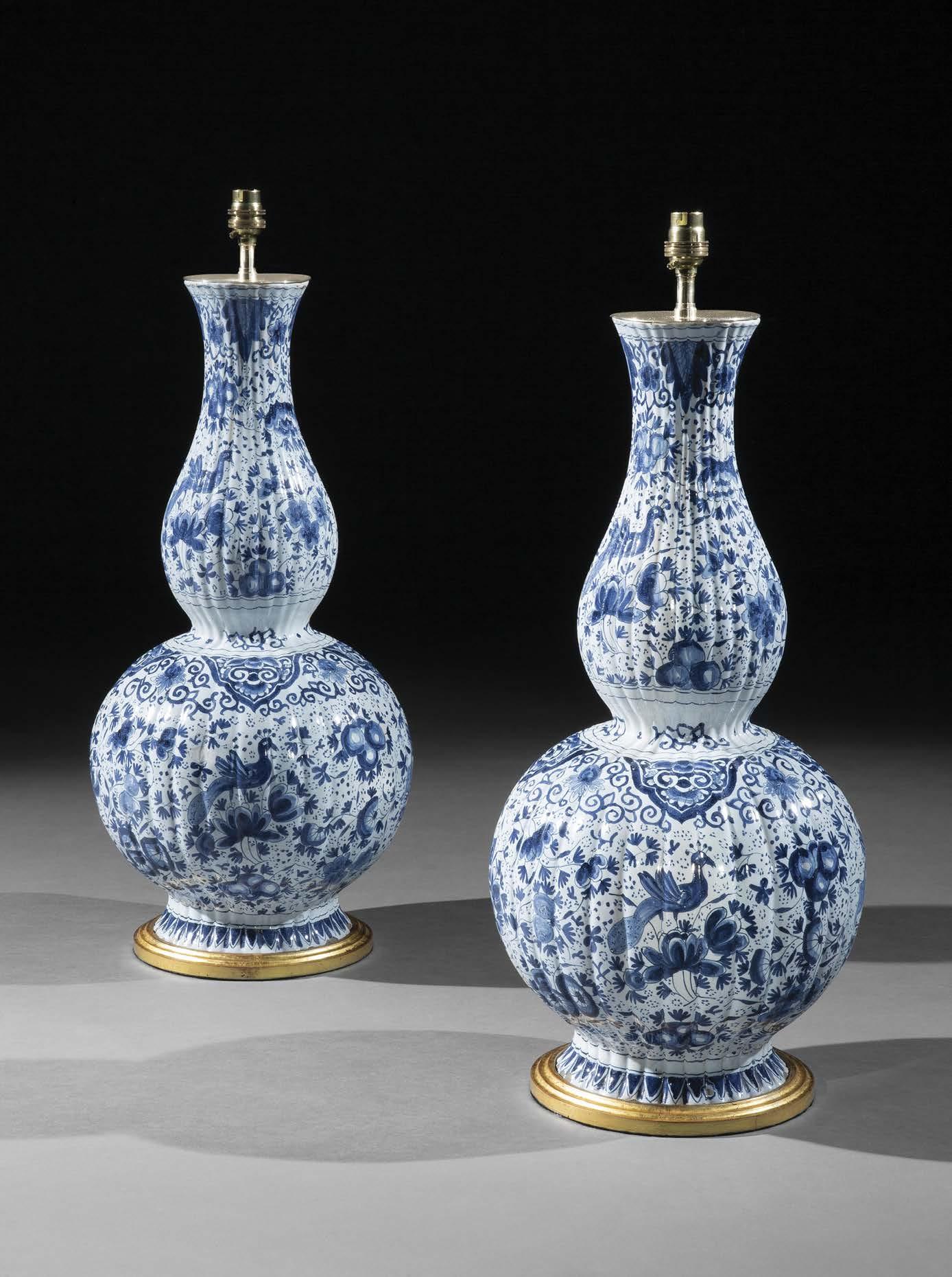 A magnificent pair of large Dutch Delft vases. Of double gourd form and decorated throughout with exotic birds amongst stylised floral and foliate decoration in tones of blues on a white background, now mounted as lamps with hand-gilded turned bases.