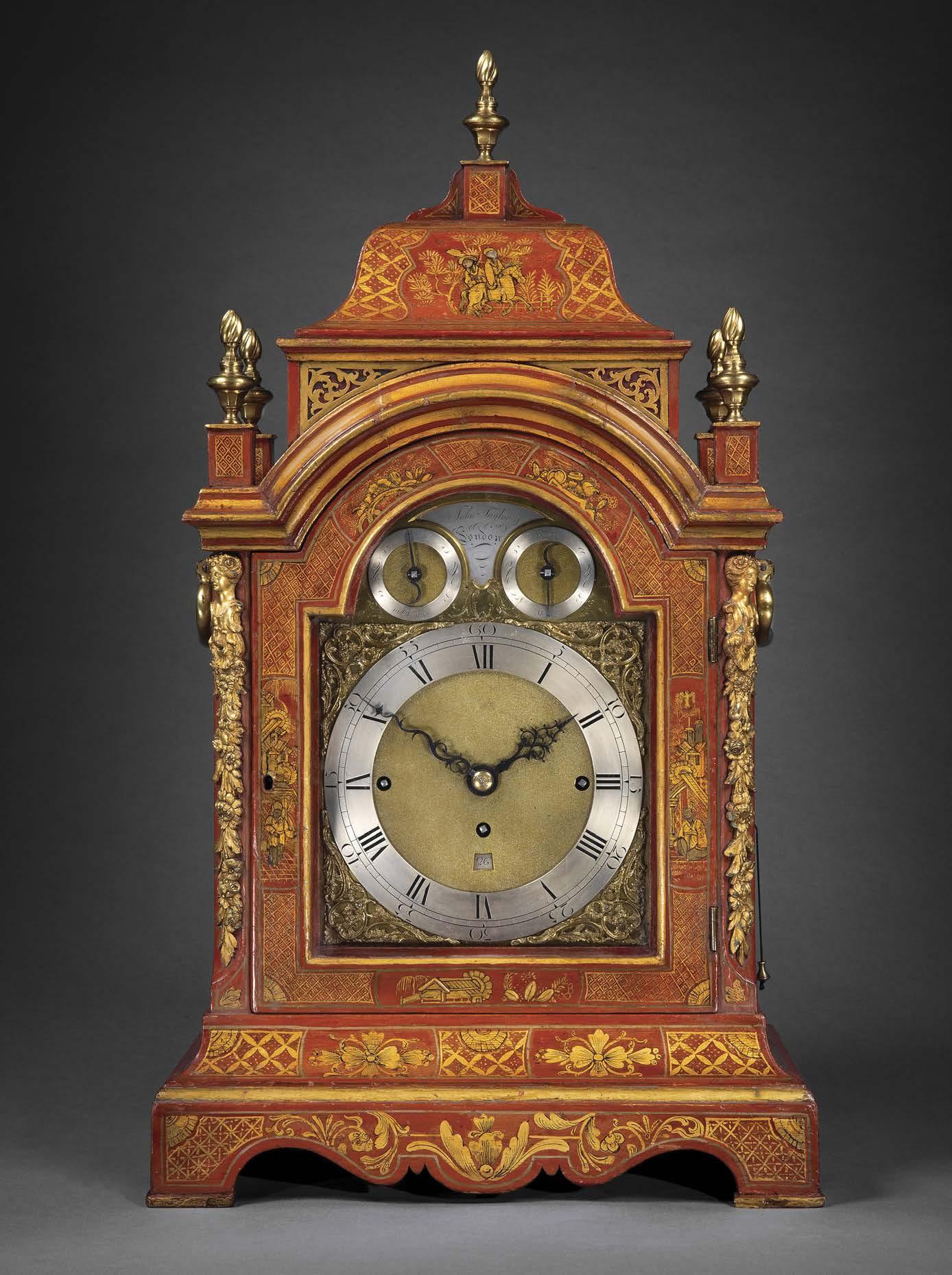 An exceptionally rare and highly important Queen Anne japanned bachelor’s chest. Decorated overall with chinoiserie designs on a scarlet red ground, the rectangular hinged top with a silk velvet-lined interior and concealed compartments, above an arched apron and three central drawers, flanked by doors each enclosing five further japanned drawers, the folding top supported by hinged gate legs, the sides similarly decorated and with bold brass carrying handles, on bun feet. The japanning of outstanding quality.