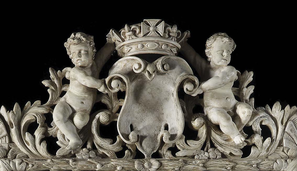 A very rare late 17th century Charles II Baroque frame, with a rectangular antique mirror plate held within a berried stiff-leaf carved slip, encompassed by pierced scrolled acanthus, fruit, flowers and pomegranates, with two opposing cherubs and scallop shell corners, the apron with a central winged cherub mask and floral swag, the cresting comprising a pair of opposing seated cherubs flanking a scrolled cartouche surmounted by a Royal crown. With remnants of the original silver leaf decoration on the carved gesso finish.