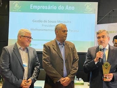 O pr imeiro a receber o troféu Mas terCana Centro Sul foi Gastão de Souza Mesquita, da Cia Melhoramen tos Nor te do Paraná, contemplado na categor ia de empresár io do ano O em presár io se destacou nessa safra pr inci palmente pela aquisição da Vale do Pa raná, que possibilitou a Melhoramentos agregar mais 2 milhões de capacidade de moagem de cana, além de conheci mento técnico importante já que a Vale do Paraná possui 85% de seus canaviais ir r igados, o que contr ibui para mitiga ção de r iscos climáticos e resulta em consistente aumento de produtividade