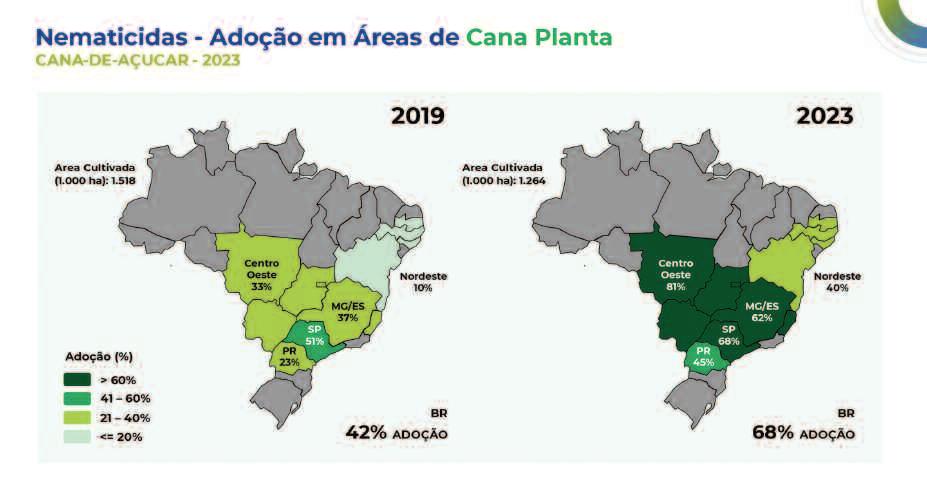 Nas áreas do país cultivadas com cana planta, prossegue o executivo, nematicidas cobr iram 863 mil hecta res em 2023, 68% do total, contra 42% de 2019 (638 mil hectares) Na média de cinco anos, acrescenta Montrasio, a adoção de nematicidas biológ icos ou bionematicidas em cana planta saltou 38 pontos, para 54% Já na cana soca os mesmos produtos alcançaram 5% da área no ano passado (348 mil hecta res), diante de apenas 1% reg istrado cinco safras antes