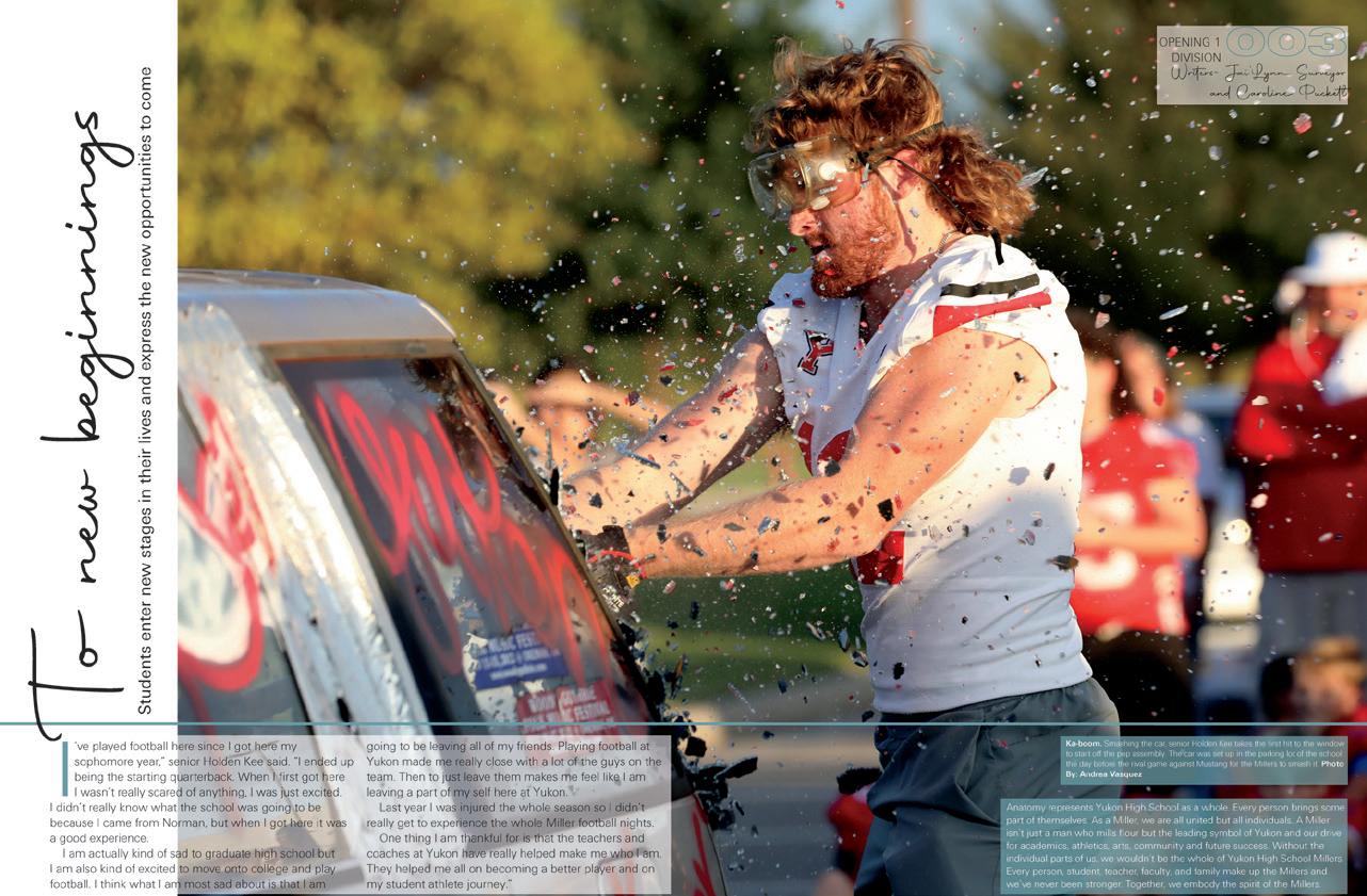 Spreads opening each yearbook section have a similar design and visually spin off of the opening/closing spread(s) design. Divider spreads feature photographs and copy that link the theme to the upcoming section’s coverage.