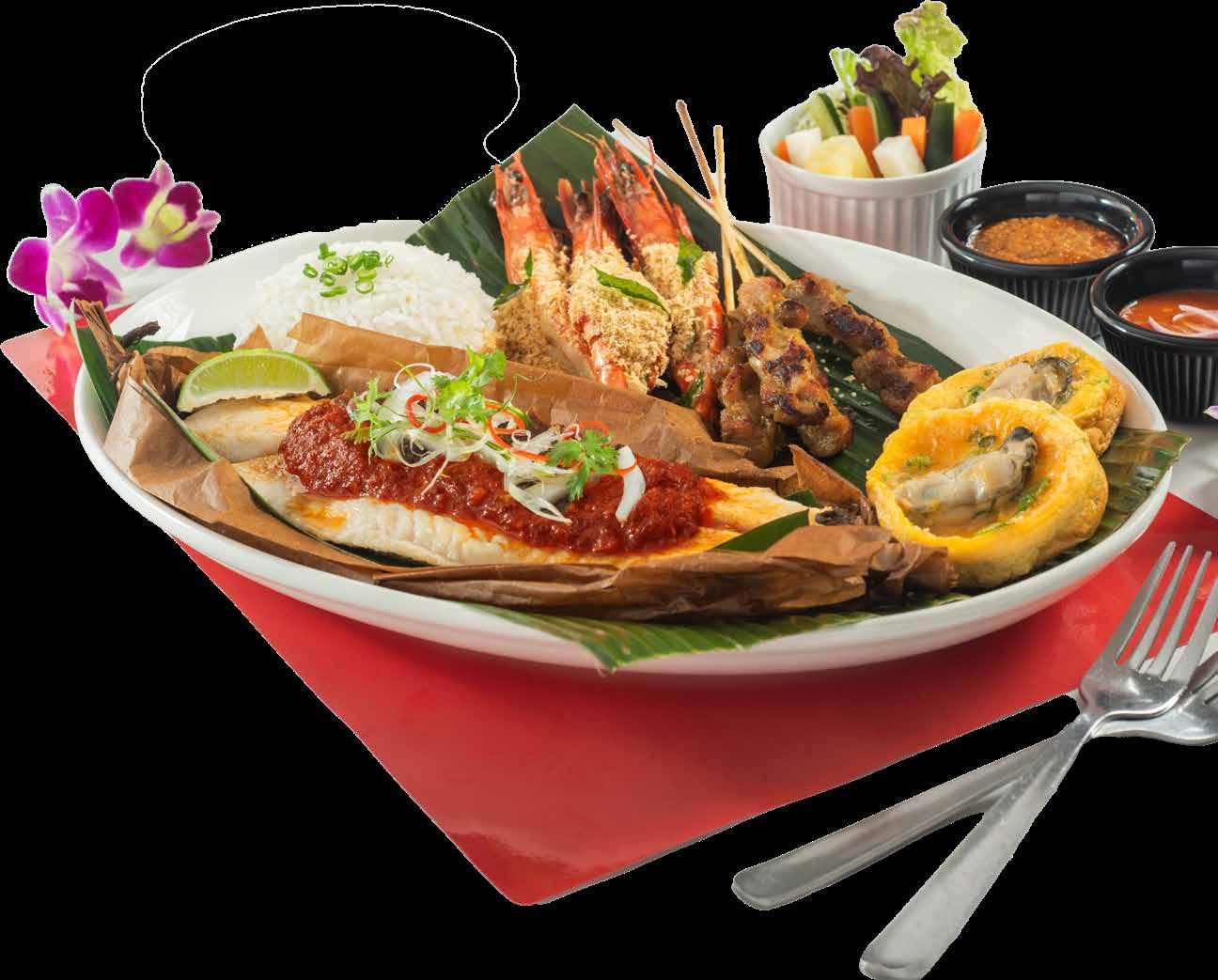 Packed with LOCALicious delights: Sambal grilled dory, cereal prawns, chicken satay with peanut gravy & orh-luah (oyster omelette) with chinchalok chilli.