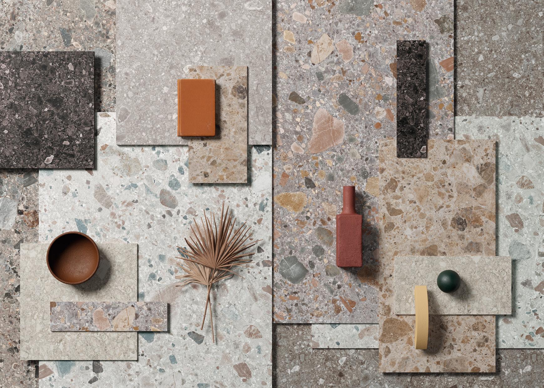 es / Un material que se caracteriza por un grano armoniosamente irregular, por guijarros de diferentes colores y tamaños, y cromatismos con efecto tridimensional.