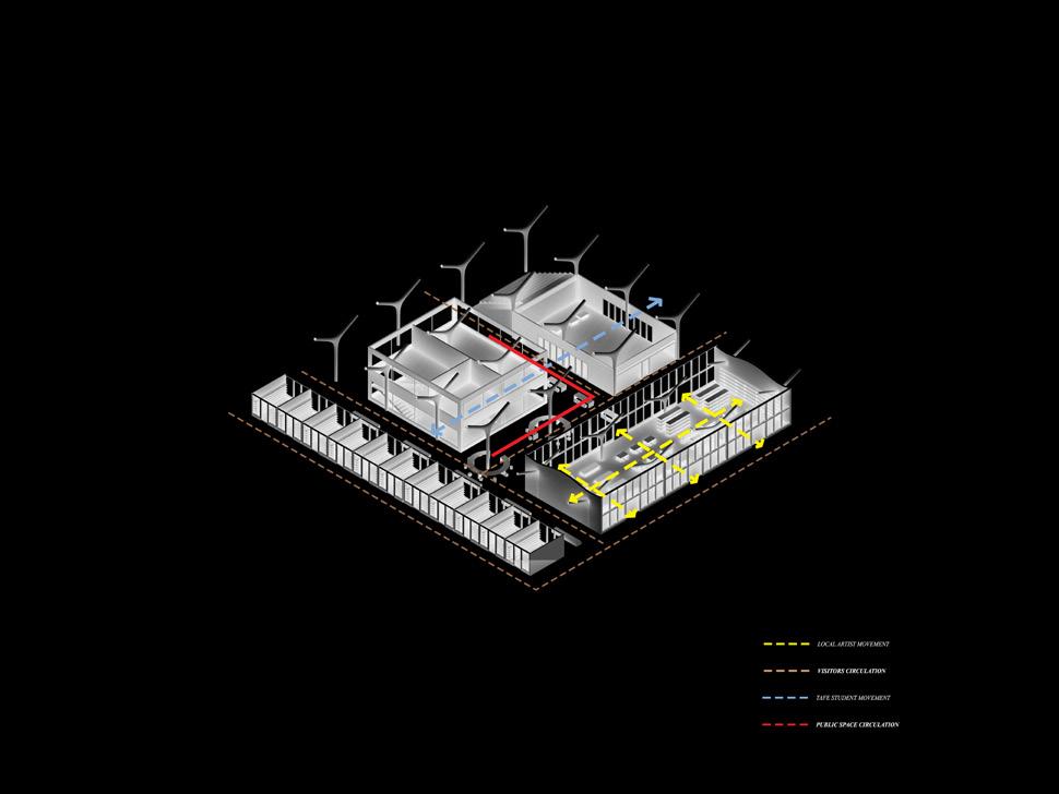SHARED WORKSHOP (exhibition, promotion) TAFE TECHNICAL AND FURTHER EDUCATION) WORKSHOP STORE GATHERING SPACES (INTERACTION, COMMUNICATION, PROMOTION ...) WORKSHOP SELFEMPLOYMENT OPEN MARKET LOCAL BUSINESS SUNDAY MARKET CAFE AREA RETAILS LOW HIGH VIBRANCY DISTRIBUTION CENTRE LOADING DOCK STORAGE LIGHT INDUSTRIAL DIRECT SALES VISITING AREA WORKING AREA winery, brewery coffee roastery catering (cake.bakery) pottery, clay studio lightweight steel frame LOCAL INDUSTRIAL RESIDENTS STUDENTS DELIVERRY ARTISTS COMMUNITY tafe coursework students from residents residents consume residents consume other communties consume workshop products saled at sunday market artists teach at tafe for future community construction storage for workshop goods in & out goods in & out goods in & out storage for market artists work at workshop artists work at workshop coffe supply residents consume advanced students could join the workshop SITE PLAN: DYNAMIC Re-organized mechanism