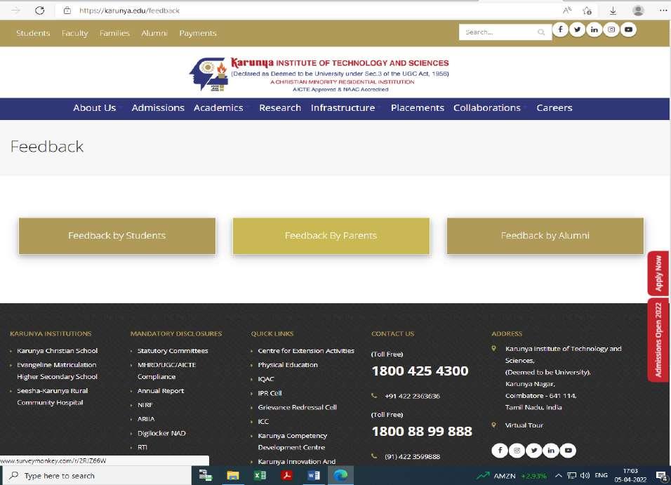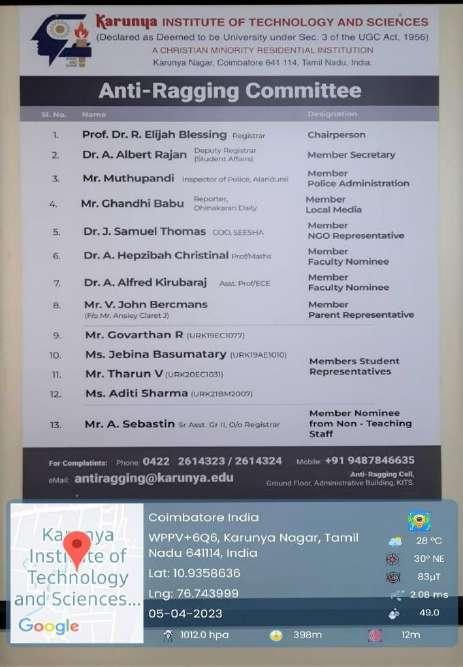 Submitting in person Sending via e-mail at antiragging@karunya.edu or "shpc@karunya.edu" or "tellus@karunya.edu"