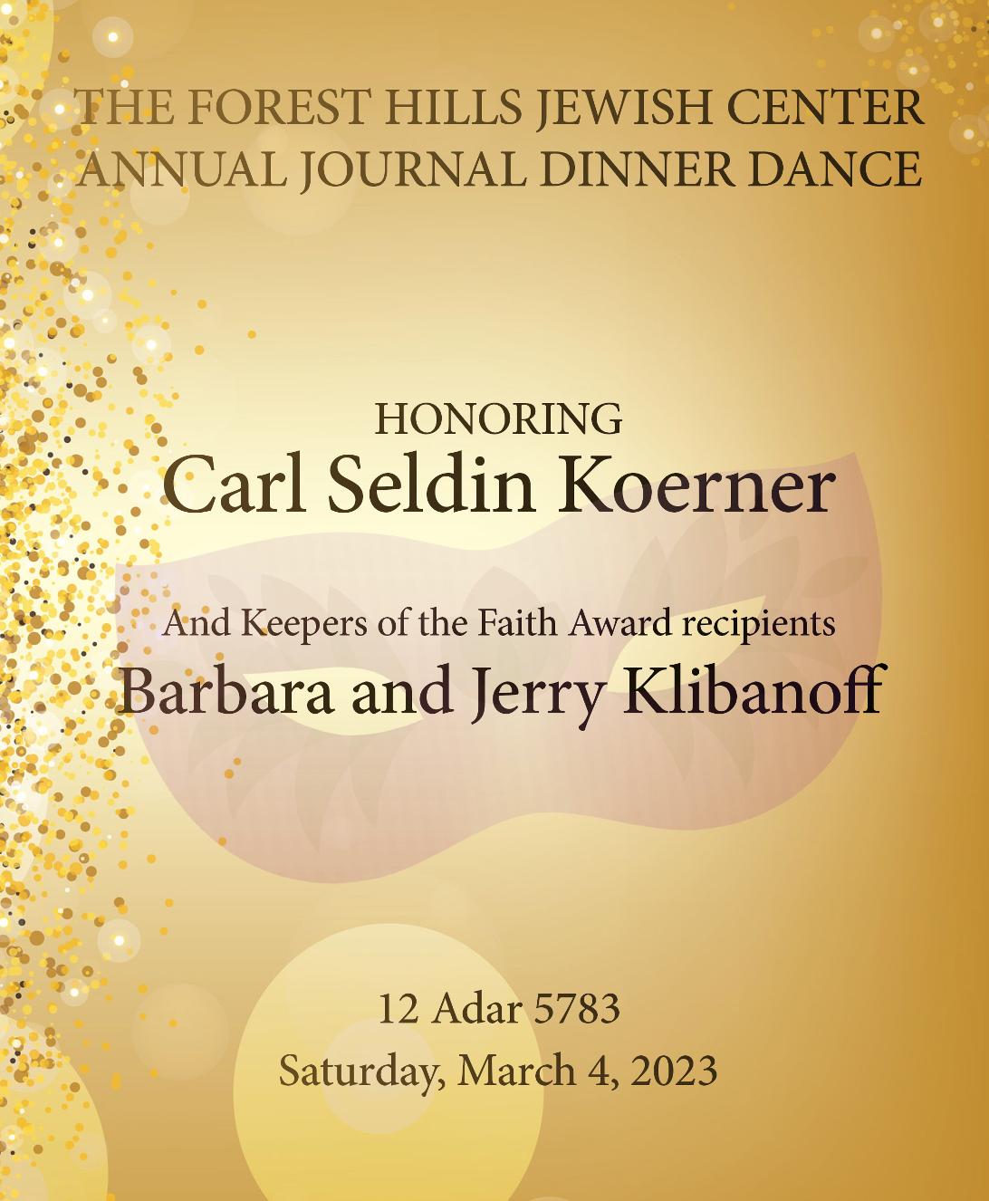 Our Journal thisyear will serveasatestament totheextraordinaryachievementsof our Honoreefor thisevening. Thisyear weareblessedtohonor Carl Seldin Koerner. Asyou all know,Carl?stirelesseffortson FHJC?sBuildingCommitteearelegendary,having startedon theinitial phasesof the?newbuildingproject?duringhisterm asPresident of FHJCin thelate?90?s. Thereafter Carl andhiscommitteeworked hardtoobtain azoning changefor thebuildingwhich provedtobeinstrumental for theeventual planned saleof our facility,which hasprovidedfor thefutureof our congregation.Carl isacurrent Board Member of FHJCwherehepreviouslyserved asPresident,Vice-President,Secretaryand Treasurer. Hispassion for our shul andhisdesireandcommitment toitscontinued vitalityandsurvival arewhat makeshim an outstandinghonoree.