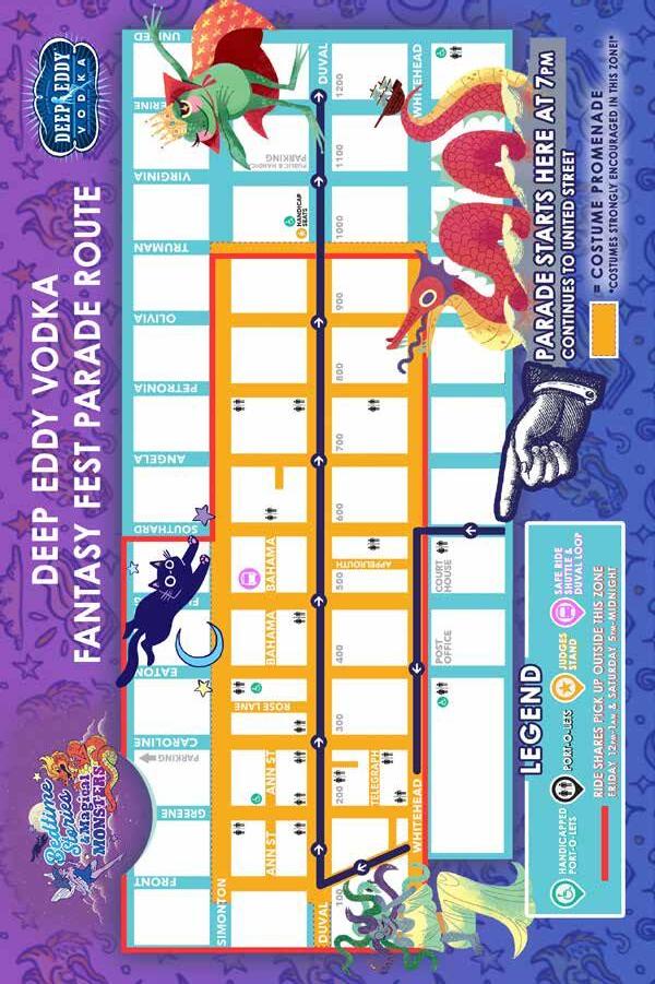 A special area for wheelchair-accessible viewing of the 2025 Deep Eddy Vodka Fantasy Fest Parade will be available on Duval Street at Truman Avenue. Accessible parking and port-o-lets will be available near the Gato Building at the corner of Virginia and Simonton Streets.
