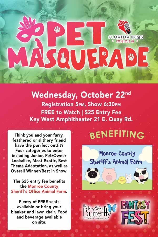 The 2025 Fantasy Fest Pet Masquerade is set for 6:30 p.m. Wednesday, Oct. 22 at the Coffee Butler Amphitheater. Registration begins at 5 p.m. and the $25 entry fee benefits the Sheriff’s Animal Farm.
