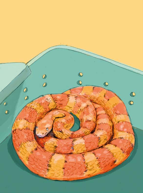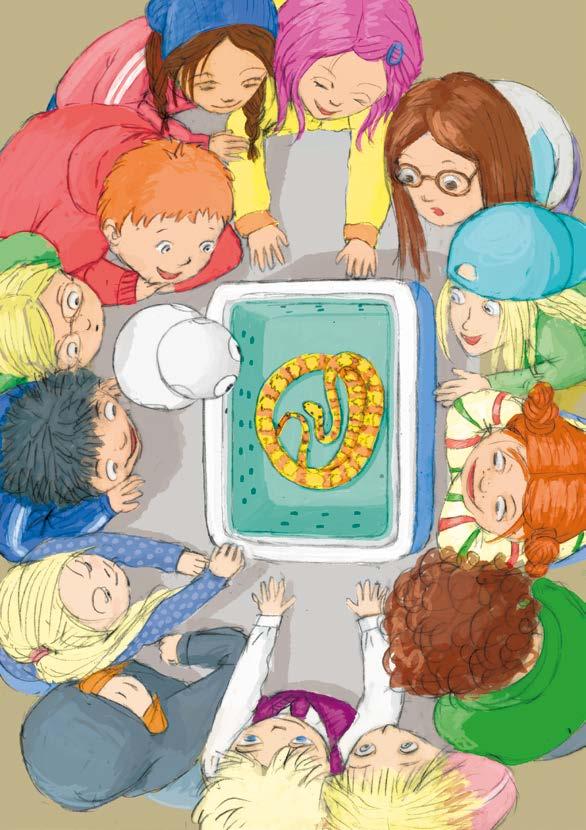 Pilvi avasi kylmälaukun ja nosti sieltä muovisen laatikon, jossa oli hengitysreikiä. Kaikki ryntäsivät katsomaan. Siellä oli punakirjava käärme.