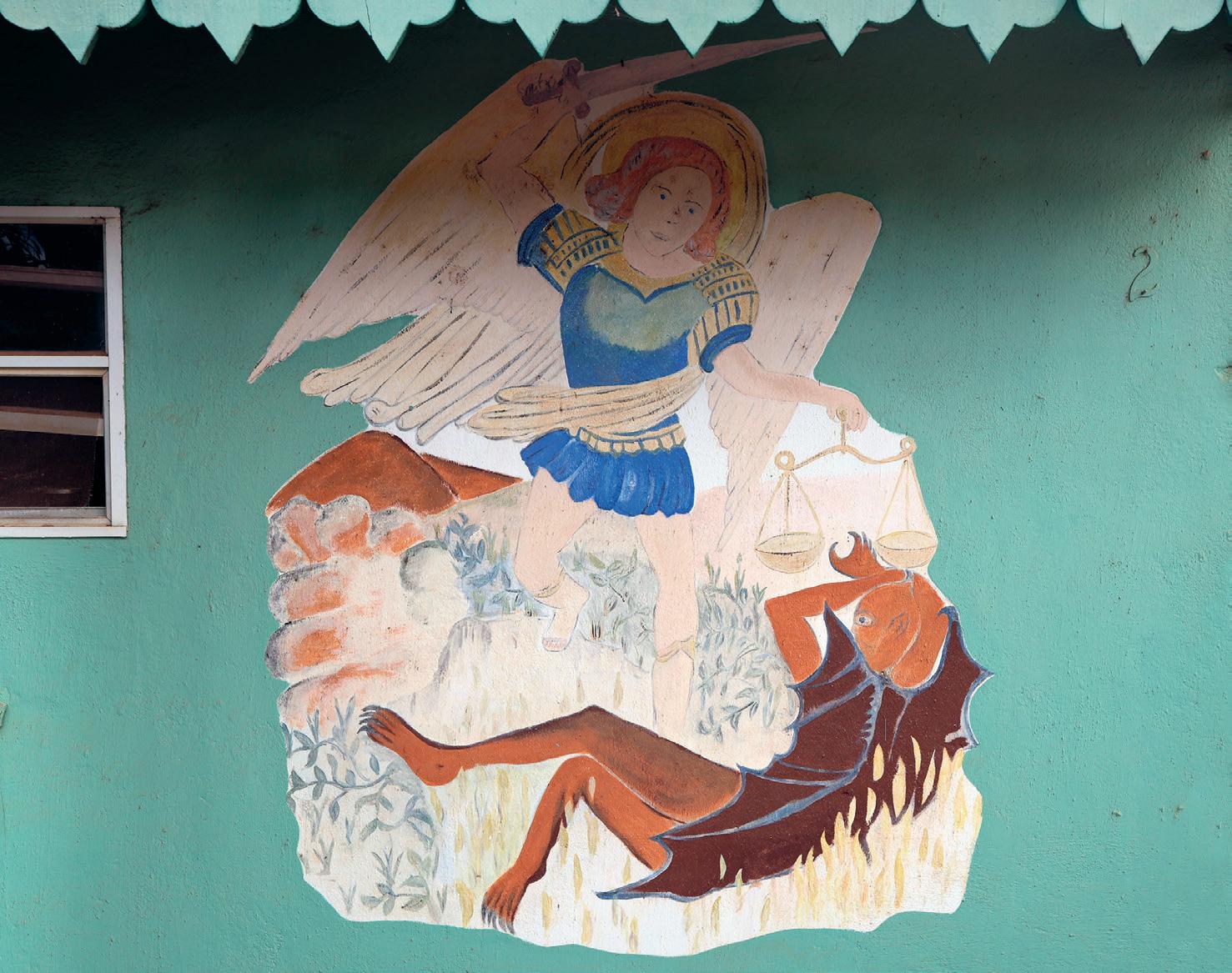 De engel Michael in gevecht met de duivel, geschilderd door Siegfried Beaumont op een huis te Rincon
